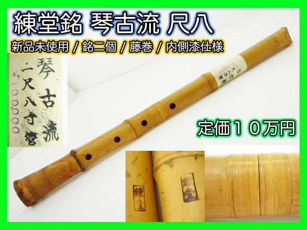 商品は新品未使用でございます。錬堂銘2個あり、中継ぎ藤巻、内側漆仕様、希少な琴古流尺八でございます。