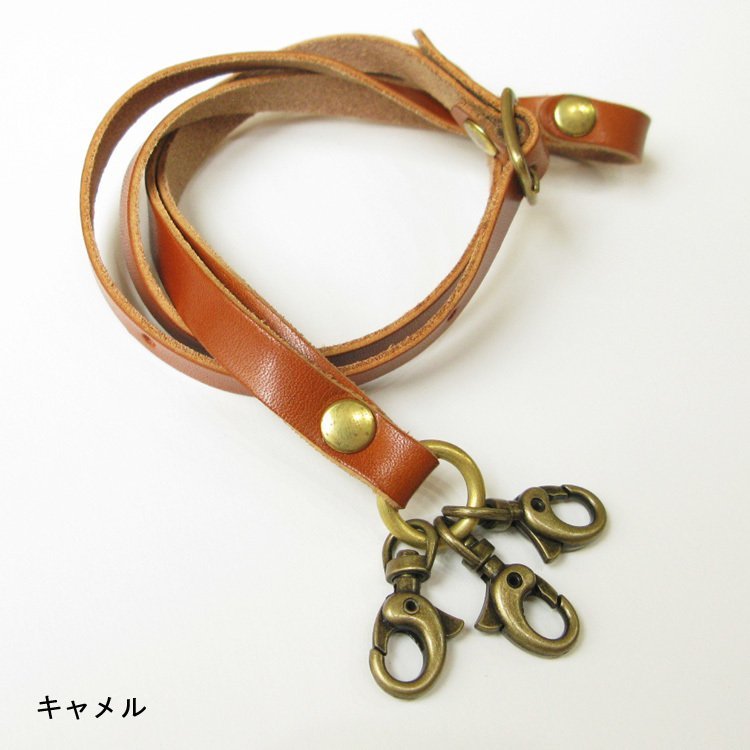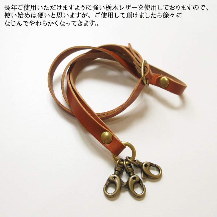 ●金具は落ち着きあるアンティークゴールド、先端の金具は3個付いています、IDケースやスマホや鍵なと色々付けていただけます。