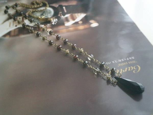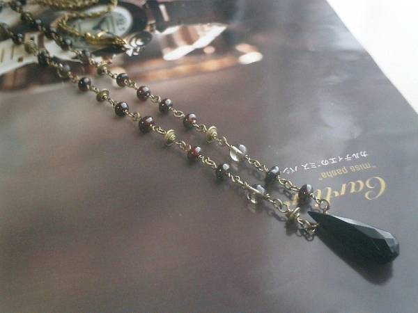 ロマンチック見本帳・・シリーズです♪赤と黒の誘惑・シックなオニキスとガーネットのネックレスです♪深い赤と黒の大人仕様のセットです♪ガーネットは7ミリ位のボタンです♪6ミリのスモーキークォーツの丸玉とクラシカルなデザインメタルを合わせてアンティークモダンな表情です♪トップは27×10ミリ位のオニキスのドロップカットです♪長さは全長70センチ位で調節自由です♪お揃いのネックレスやブレスレットやピアスも出品しています♪シンプルで飽きのこないいつまでも着けられるデザインを考えて作りました!ハンドメイドをご理解頂いてノークレーム、ノーリターンでお願いします