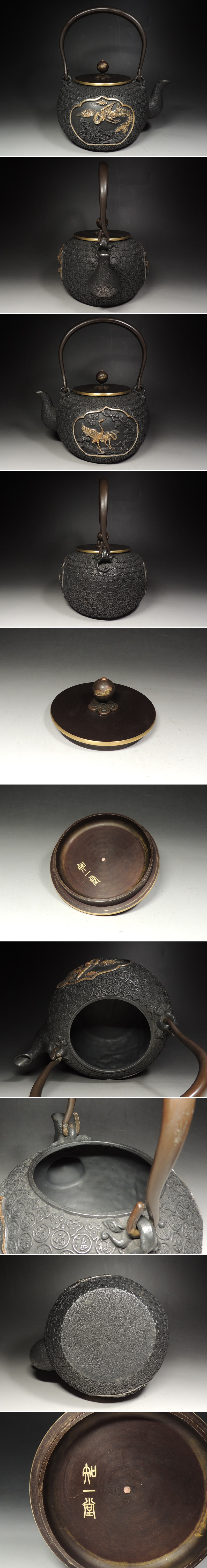 | ■中国古玩■鉄瓶・知一堂・福字・盛上鳳凰鶴紋彫・銅蓋・銅持手・茶器・煎茶道具・f118 | ||||||||||||||||||||