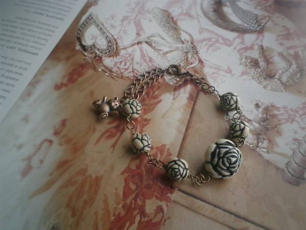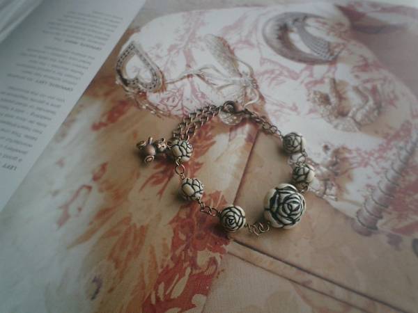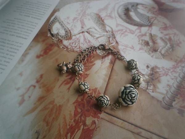 私的・乙女心・・シリーズです♪アンニュイな薔薇・・シックな薔薇のブレスレットです♪甘すぎない大人のロマンチックしています♪アイボリーホワイトの樹脂薔薇は10ミリと14ミリ位の大きさ違いです♪キュートな表情のブレスレットです♪長さは全長23センチ位で調節自由です♪♪お揃いのネックレスも出品しています♪シンプルでいつまでも着けられるデザインを考えて作りました!ハンドメイドをご理解頂いてノークレーム、ノーリターンでお願いします