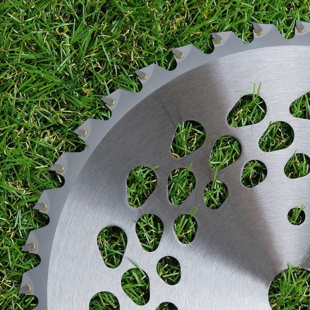 基盤の穴明き部分を大胆に多くしても十分に強度を保持できる形状にすることにより更なる軽量化を実現しました。 良質なチップを完全斜め埋め込みと4面研磨加工することにより衝撃に強く良好な切れ味に仕上げました。 超軽量で耐久性・切れ味に優れていますのでとても快適に草刈作業ができると好評です。 ■外径255mm×刃数40枚 穴明き超軽量タイプ ※2枚での価格です。 | ||||||||||||||||||||||||||||