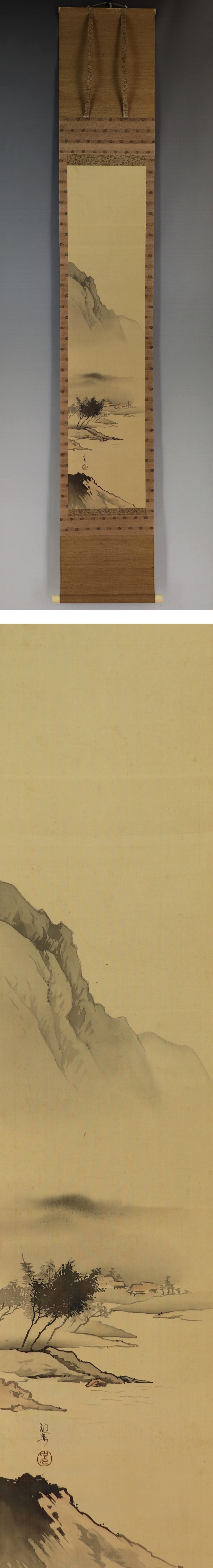橋本雅邦 はしもと-がほう(1835-1908) 明治時代の日本画家。天保6年7月27日生まれ。江戸出身。 幼名は千太郎,のち長卿。狩野雅信に入門。 フェノロサ,岡倉天心らの鑑画会に参加し,狩野芳崖らと新画風を開拓。 明治23年東京美術学校(現東京芸大)初の日本画教授となる。 31年辞職して天心とともに日本美術院を創立した。 明治41年1月13日死去。74歳。 本紙は、染み、汚れ、ヤケがあります。 表装は、染み、軽い皺、擦れ、生地剥れ、虫食い、金具部に錆、軸先にヒビがあります。 【サイズ】 作品 横約24.5cm×縦約107.5cm 表装 横約30cm×縦約185cm |