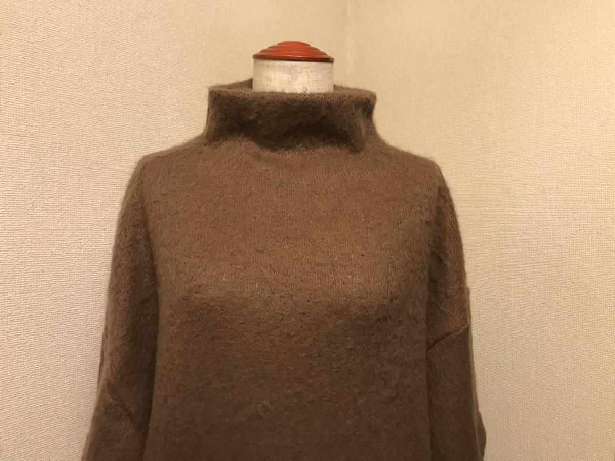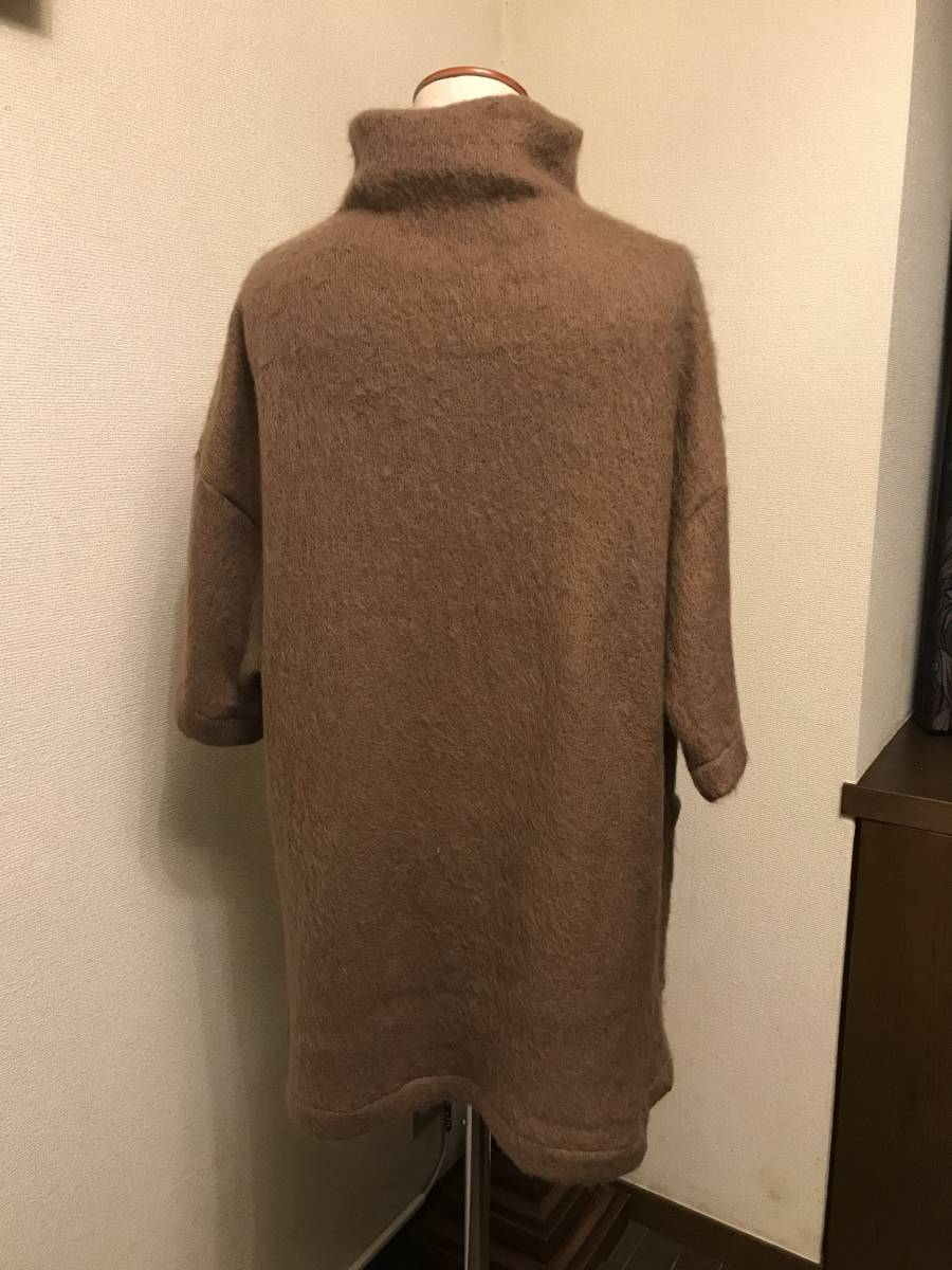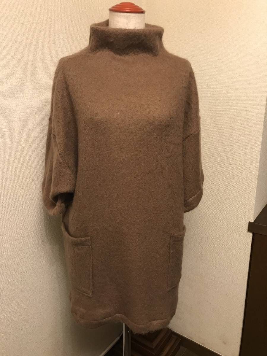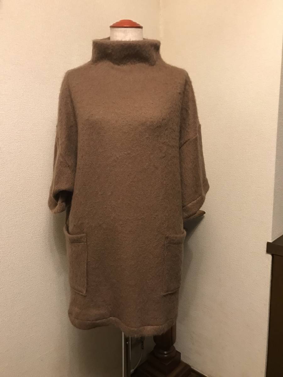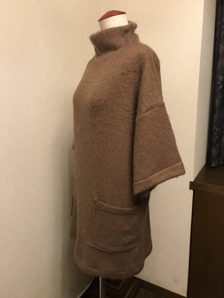 ウール アクリル混の フワフワ感のある、編み目の緩い、暖かい、ニット生地を仕立てました。前にポケットが2つあるデザインです。ボトルネックで、衿元暖かく、長めの丈と、オフショルダーに広い袖。ゆったり幅のベストですので、重ね着コーディネートしやすいデザインです。マロンブラウンの、上品な色調です。
