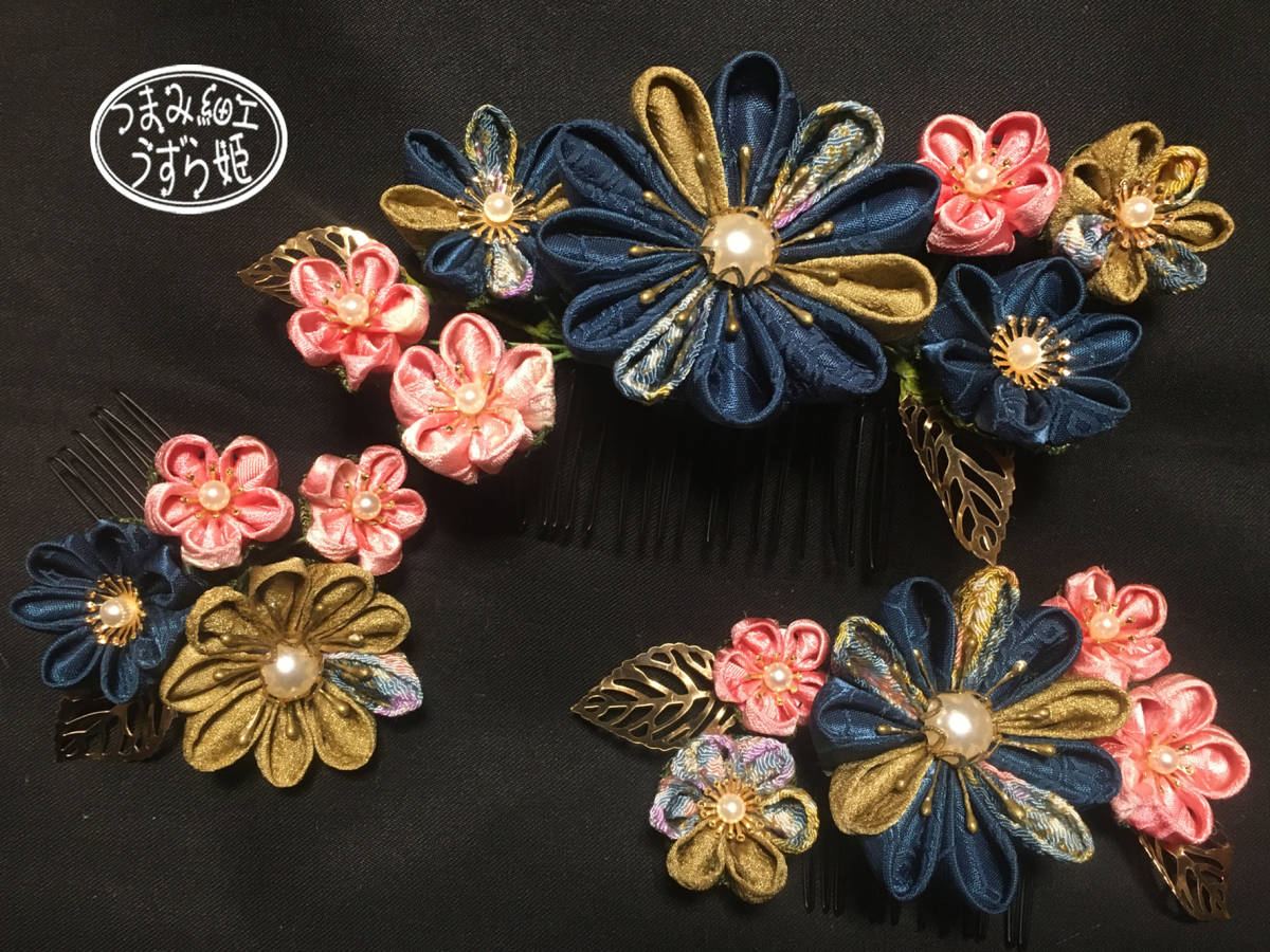 慶祝の華3点セット藍色と金茶和柄の平菊、小菊コーム かんざし つまみ細工 和装 成人式 前撮 卒業式 ヘアアクセサリー ウエディング