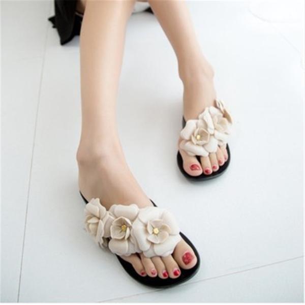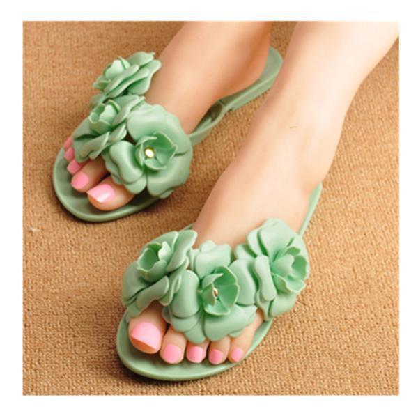 レディースぺたんこローヒールかわいいサンダル花23CMグリーン