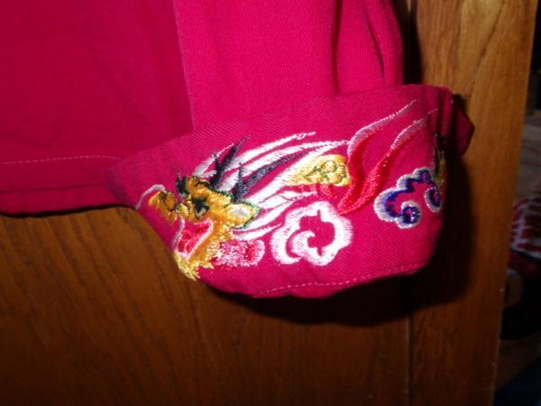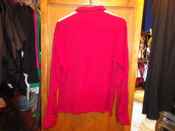生地は首元に斜めのジップがあるタイプの物より厚手でしっかりとした生地です、カラーはエンジカラー、胸と胸元のポケットのふちがベロアでベージュ(元々はグレーでしょうか?)になります♪