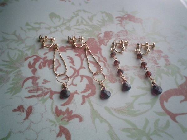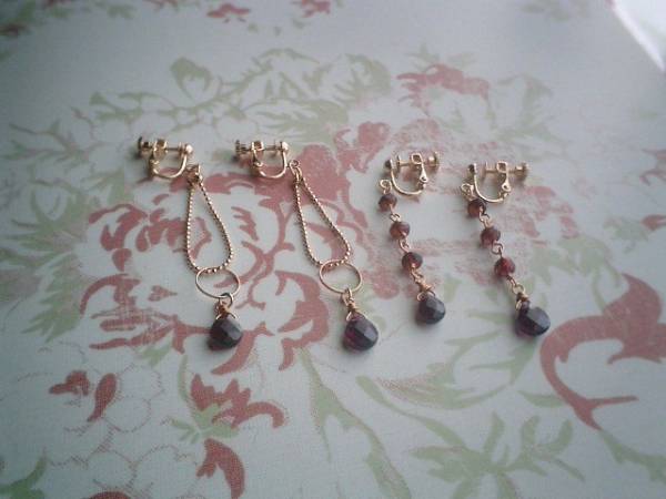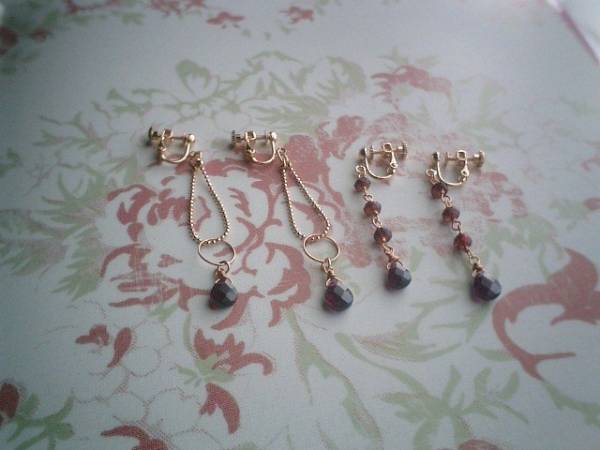 ロマンチック正統派・・シリーズです♪小さな宝石箱・・シックなガーネットのイヤリング4本セットです♪ペア2組です♪♪深い赤のガーネットにピンクゴールドのチェーンを合わせて秋のロマンチックしています♪ガーネットは5×3ミリのボタンカット、9×7ミリ位のドロップカットです♪長さは左のペアが全長7センチ位、右側のペアが5・5センチ位です♪ピアスにも変更出来ます♪それぞれ単品やお揃いのネックレスやブレスレットも出品しています♪♪シンプルで長く着けていただけるデザインを考えて作りました♪ハンドメイドをご理解頂いてノークレーム、ノーリターンでお願いします