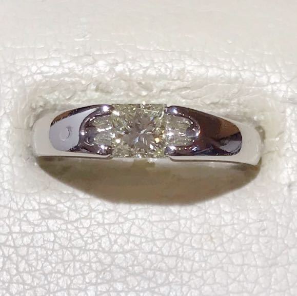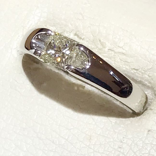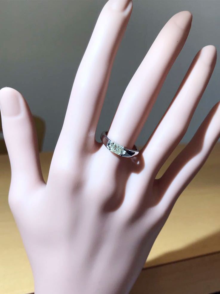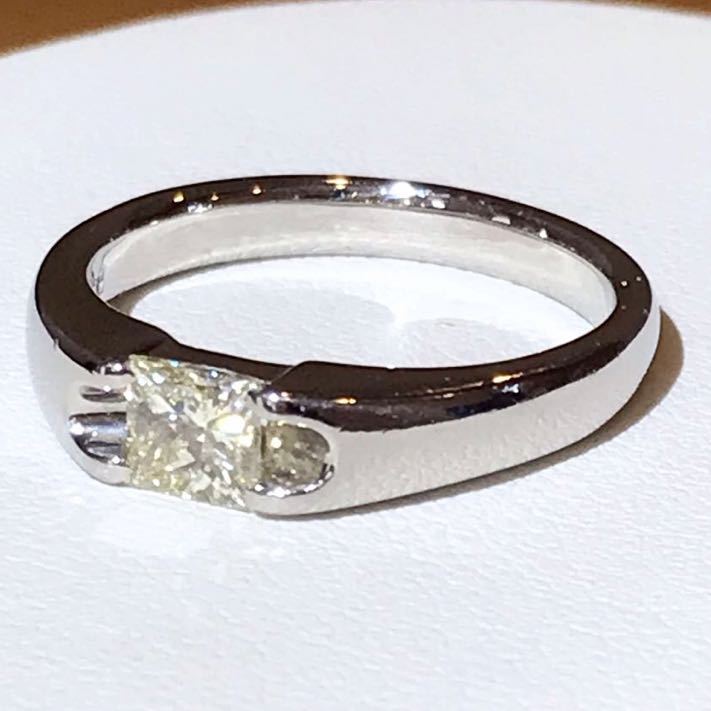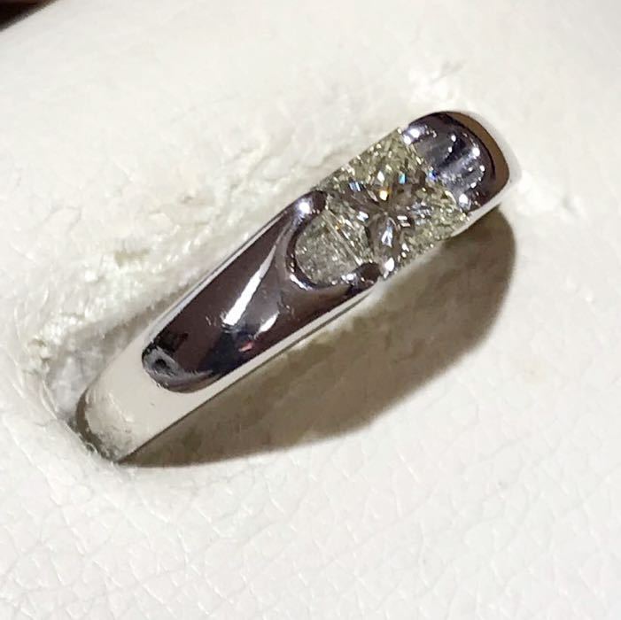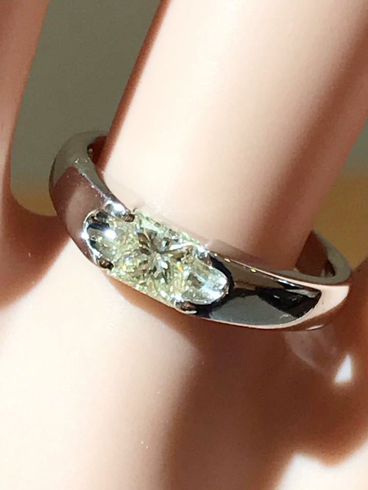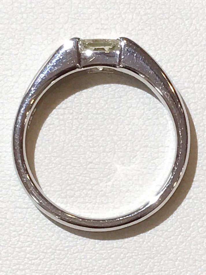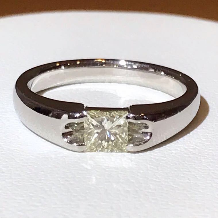 こちらは、Pt900台にプリンセスカットダイヤ 1石付きリングです。