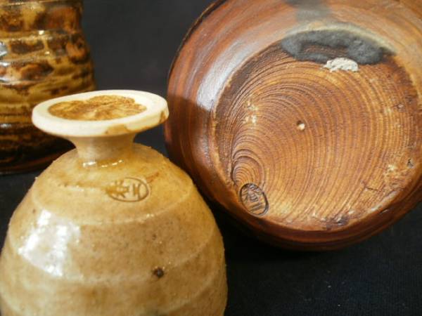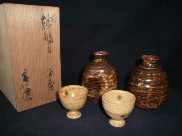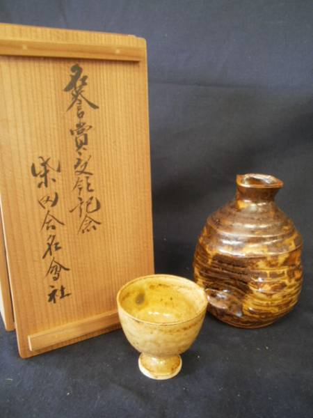 酒壷(加藤春二作)※箱蓋裏に記念品の記載有り(酒壷高さ約95mm,ぐい呑み直径約48mm,高さ約44mm)