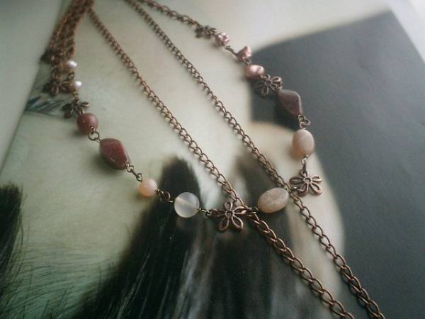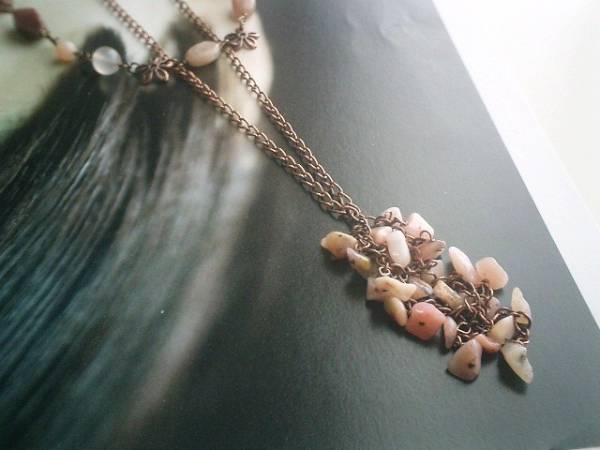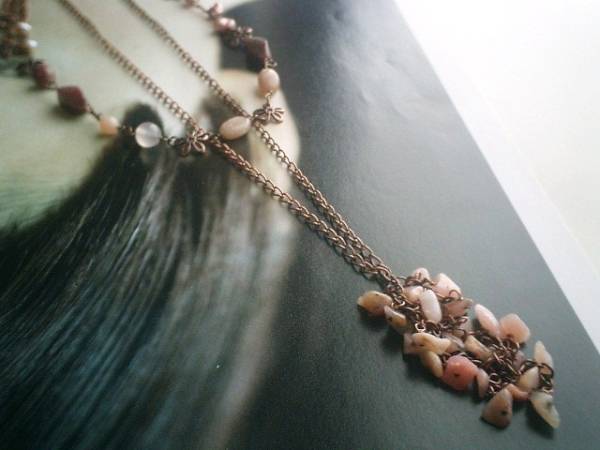 フラッパーガール・・シリーズです♪可愛い人・・モーヴピンクでまとめた可愛いネックレス2本セットです♪長い方のネックレスはピンクオパールのさざれをトップに集めたキュートなネックレスです♪長さは全長72センチ位で調節自由です♪トップは7センチ位です♪短い方のネックレスはロードナイトの8ミリの丸玉やツイスト、オレンジムーンストーンの12×8ミリのオーバル、ピンクカルセドニーの丸玉、ピンクオパールの丸玉、ピンクベージュの芥子パールなどニュアンスのあるピンクの石にお花のチャームを合わせて大人のロマンチックしています♪長さは全長57センチ位で調節自由です♪それぞれ単品でも出品しています♪お揃いのブレスレットも出品しています♪♪シンプルで飽きのこないいつまでも着けられるデザインを考えて作りました!ハンドメイドをご理解頂いてノークレーム、ノーリターンでお願いします