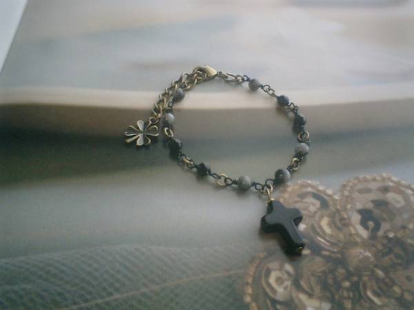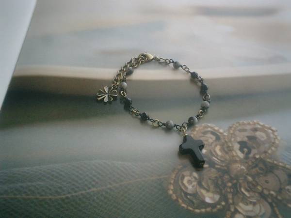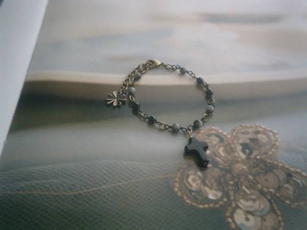 センチメンタル・ガール・・シリーズです♪切ない思い・・シックなオニキスのブレスレットです♪4ミリのランダムカットのオニキスに4ミリの丸玉のラブラドライトや12×16ミリくらいのオニキスのクロスを合わせてさりげなくロマンチックしています♪長さは全長22センチ位で調節自由です♪お揃いのブレスレットやネックレスも出品しています♪♪シンプルで飽きのこないいつまでも着けられるデザインを考えて作りました!ハンドメイドをご理解頂いてノークレーム、ノーリターンでお願いします
