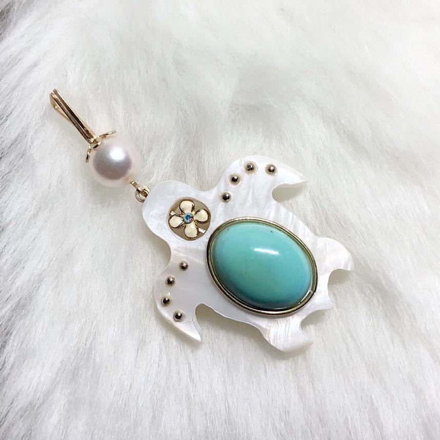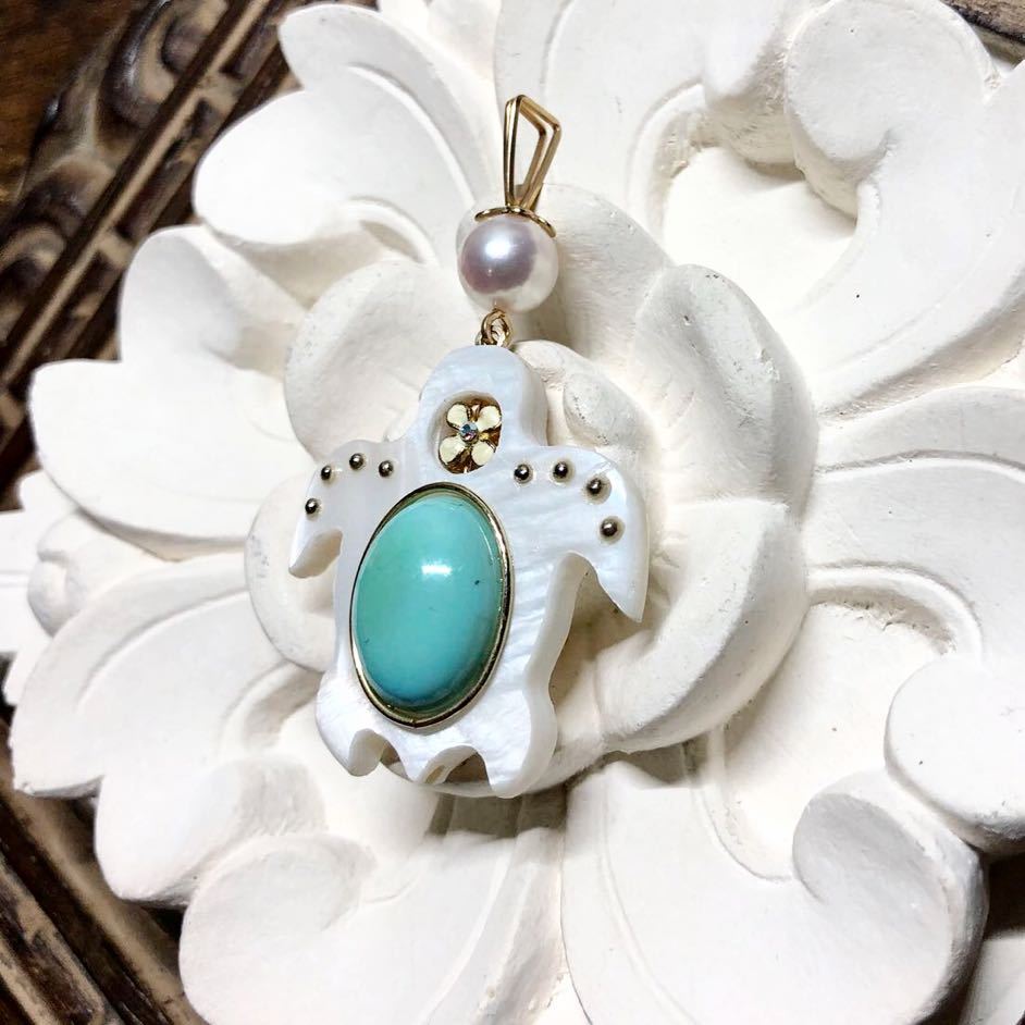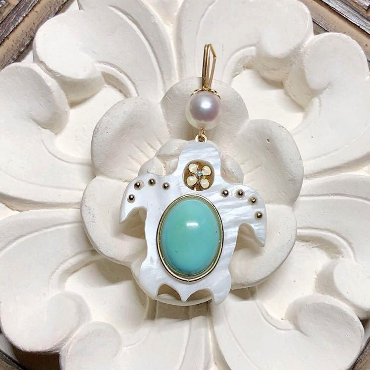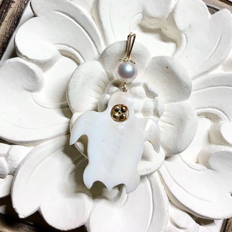 高品質のほんのりピンクがかったあこや真珠がまた可愛いです♪(*^^*)シェルで出来たホヌがとても素敵ですよ。