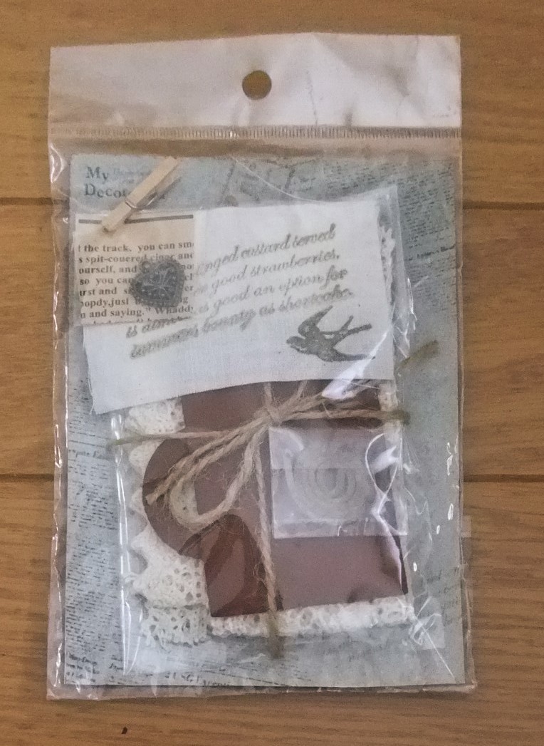 革・レース・プリント生地・ミニせんたくばさみ・英文紙・ハートチャームなどがセットされています。