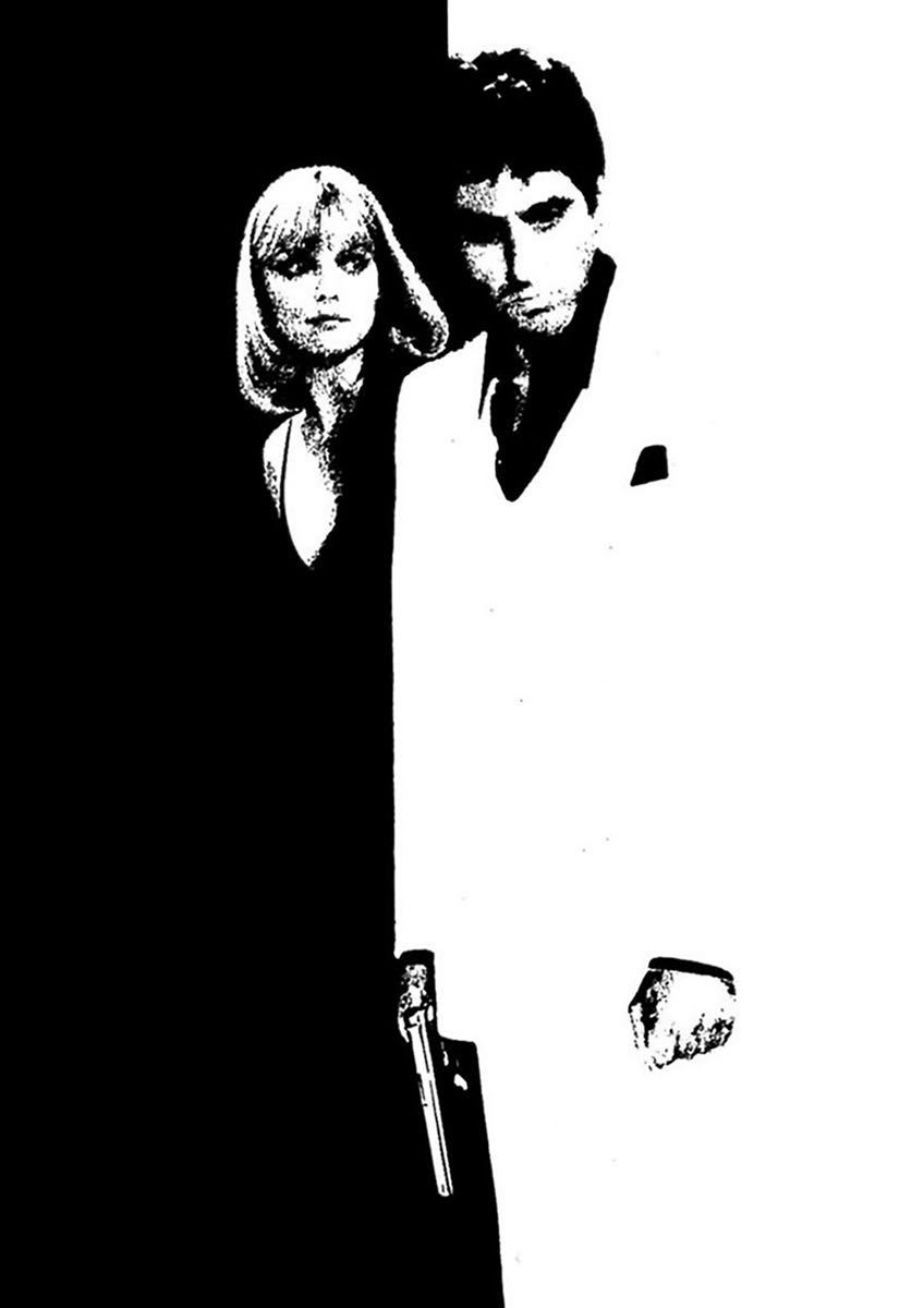 アル・パチーノとミシェル・ファイファーのクールなハーフコントラストモノクロイラストデザインです。