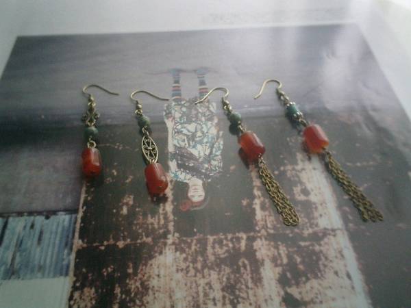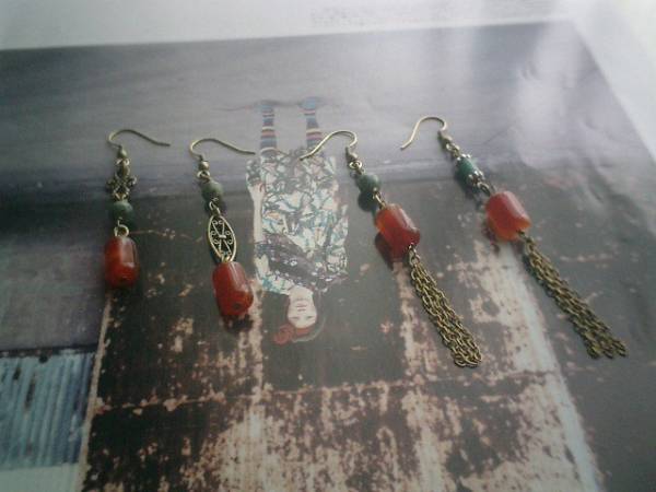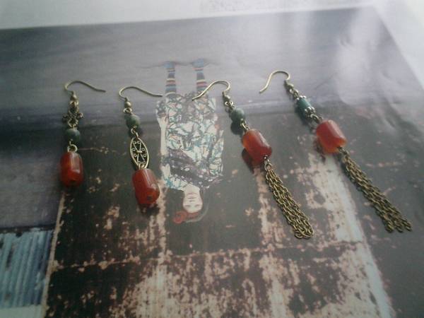 巴里の香り・・シリーズです♪エスニック気分・・シックなカーネリアンとターコイズのピアス4本セットです♪ペア1組とデザイン違い2本の合わせて4本です♪色々な組み合わせで楽しんでいただけます♪ターコイズは4×6ミリのチューブや4×15ミリのキューブや6ミリの丸玉など個性的なデザインを集めました♪深いオレンジブラウンのカーネリアンは8×10ミリ位のチューブです♪オリエンタルなデザインメタルを合わせて大人のロマンチックしています♪長さは左から6・5センチ、7センチでペアが9センチ位です♪イヤリングにも変更出来ます♪お揃いのネックレスやブレスレットも出品しています♪シンプルで飽きのこないいつまでも着けられるデザインを考えて作りました!ハンドメイドをご理解頂いてノークレーム、ノーリターンでお願いします