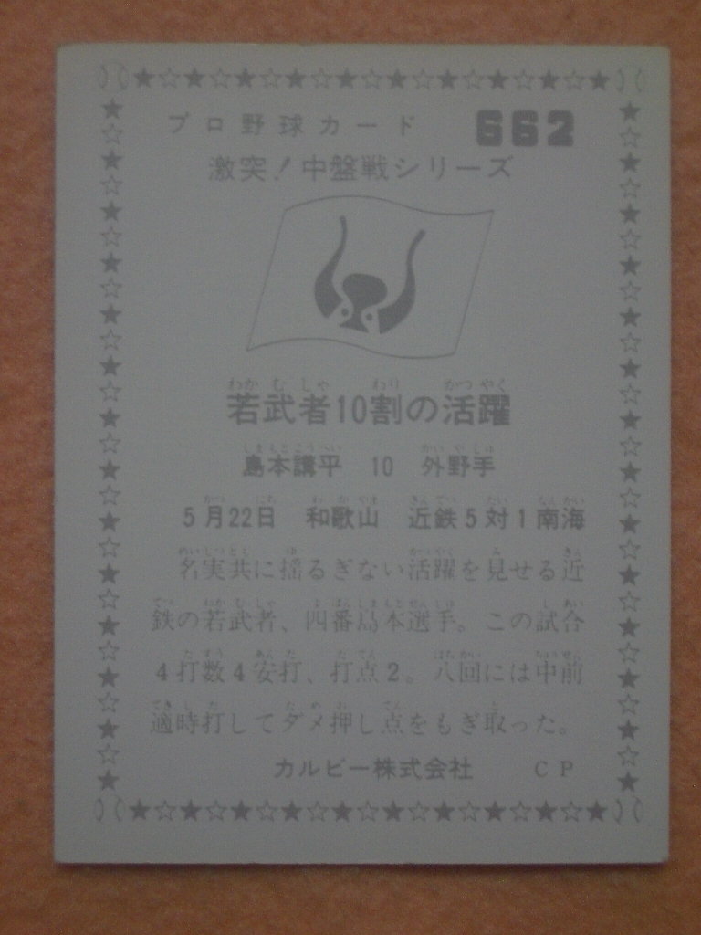 カルビープロ野球カード’76年 662「激突!中盤戦シリーズ」島本 講平(近鉄)です。 約40年前と何分古いだけに変色、キズ、汚れ等の経年劣化がないとはいえません。 その他詳細は写真にてご判断下さい。 カードコレクター以外で商品価値のわからない方、神経質な方のご入札はご遠慮下さい。 以上のことに十分ご理解、留意されました上でご入札いただきノークレーム・ノーリターンでお願い致します。 |