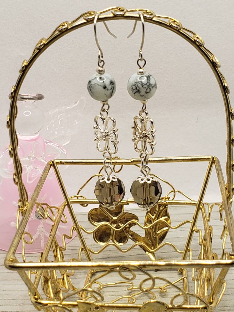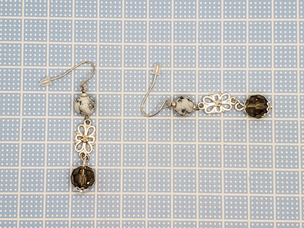 素材は柄入りビーズ、シルバーデザインコネクター、多面カットビーズです。