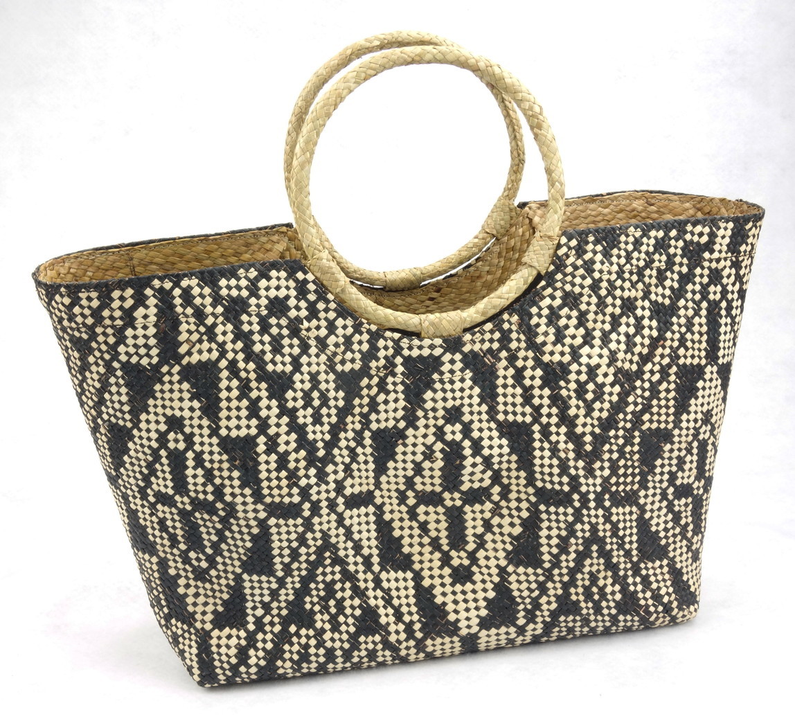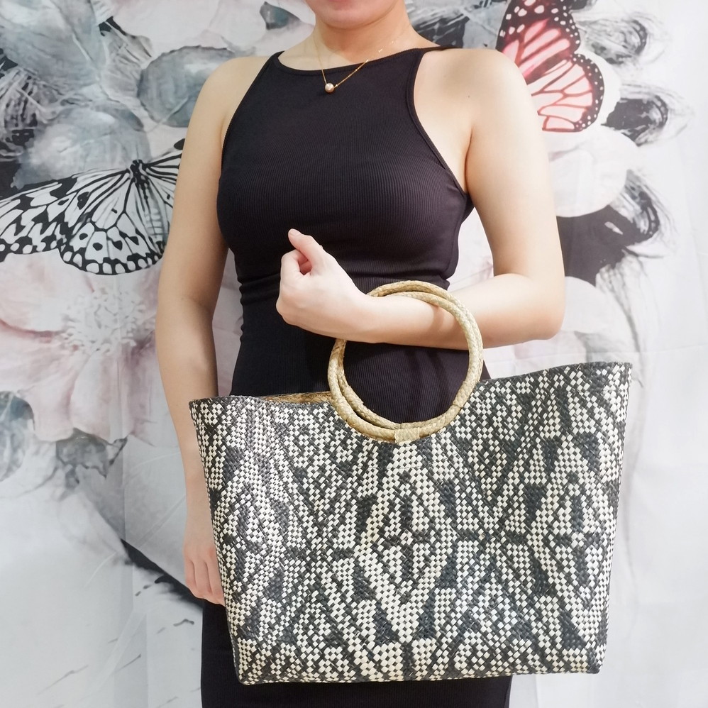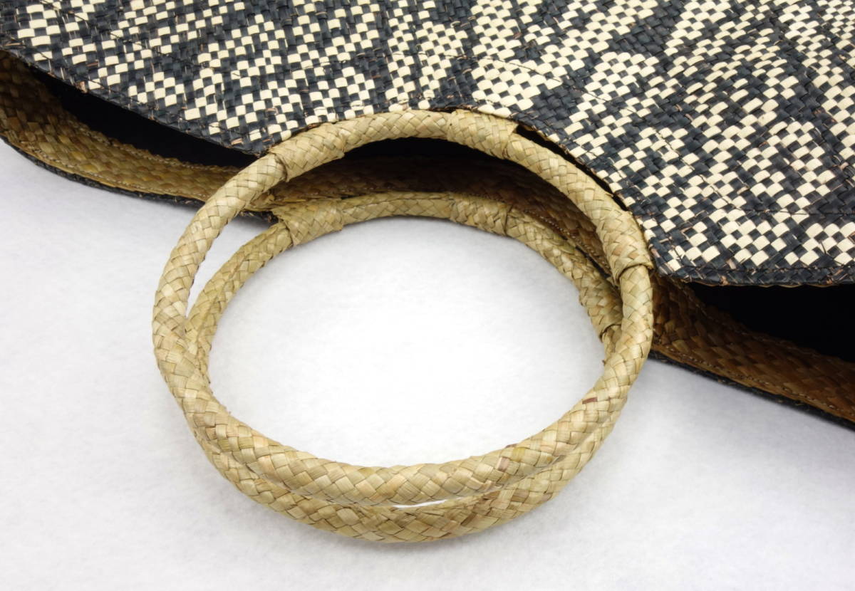 バニグはフィリピンで昔から作られている伝統的な手織り物で、ヤシ系植物の葉(ブリ、パンダナス、ティコグなど)から手作業で作られ、主にマットとして使われていました。この技術が発展し、マットだけではなく、帽子や靴、バッグなどに用いられる様になりました。 ここ数年、ヨーロッパやアメリカで大変話題となり、多くのセレブにも人気が高まっています。この需要の高まりと共にフィリピンの大事な産業になり、仕事のなかった地域の人の収入源にもなっています。 素材となる葉の加工は全て手作業で行われ、乾燥は天日干しの為、天候に左右されます。その後、用途に応じて、様々な色で染色が施されます。通常バニグを1枚作るのに職人さん1人が1週間かかり、さらにバッグに加工するのに別の専門の職人さんが1~2週間かけて作ります。 サイズ 全高:約36cm 高さ:約27cm 上幅:約45cm 下幅:約33cm マチ:約12cm 取っ手内径:約13cm ハンドメイド商品について:当商品はハンドメイドの為、商品によっては多少の型崩れがある場合が御座いますが、これはハンドメイドの魅力でもあります。アジアン雑貨特有の小さなキズやヒビ・色むら等は、ご理解頂ければと思います。 写真のモデルさんの身長は約160cmです。 撮影はフィリピンで行いました。 | |||