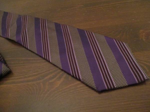 | 商品紹介 | 濃いパープル薄いパープルの斜めストライプに、白のドット柄が良いです。 シンプルで合わせやすいデザインです。 3本先部分に凹凸が付いています。 シルク100% |