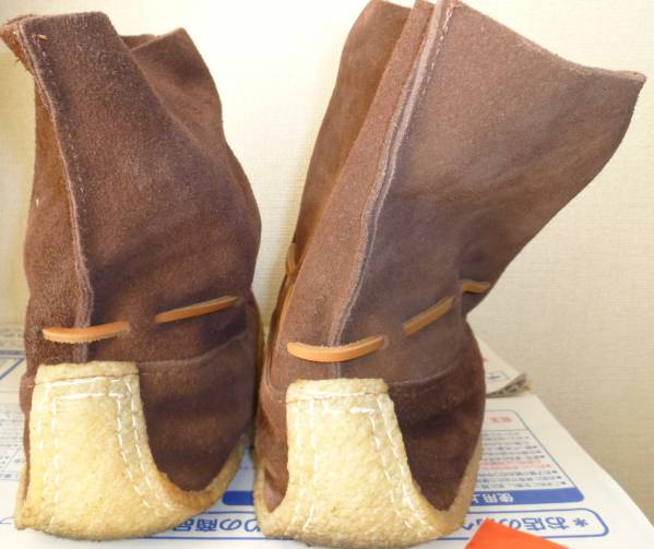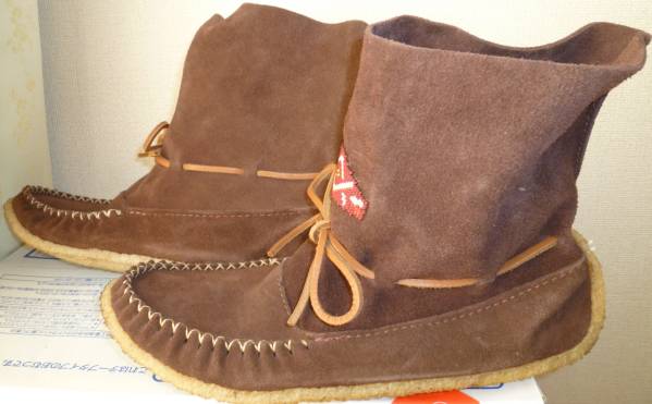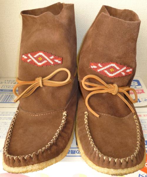 かなり本格的で雰囲気のあるブーツになり、茶色のスエードを縫い付けサイズ調整のレザー紐、フロントにはビーズがあしらわれ大変おしゃれなモカシンになります。