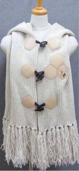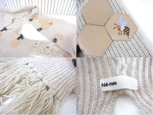 【商品名】Ne-net/ネネット ミツバチ刺繍フード付ニットマフラー /コート /ストール/ハチの巣/フリンジ/レザーパッチ/アイボリー
