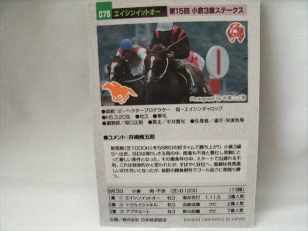 | ☆☆☆商品説明☆☆☆ 【メーカー】 バンダイ 【シリーズ】 95年サラブレッドカード 【番号】 075 エイシンイットオー 【種類】 GⅢカード 【数量】 1枚 サラブレッドカードの第1弾95年度のカードになります。 |