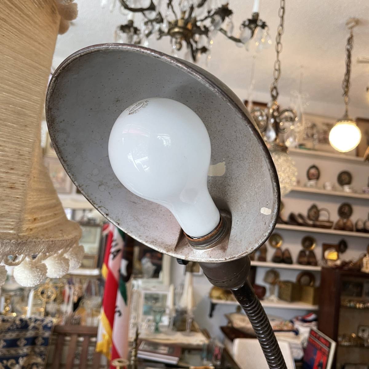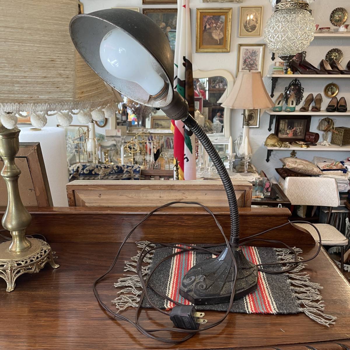 ★アメリカで購入しましたビンテージ卓上ライトになります。  1920~30年代頃の古いランプです。首部分は角度調整可能です。  電球は市販の26mm口径の一般的なタイプですのでご用意ください。  状態ですが経年による金属劣化や塗装の剥がれ、傷や汚れ等の使用感はございますが全体的には目立つダメージもなくよい状態だと思います。ビンテージ物とご理解頂いてお願い致します。