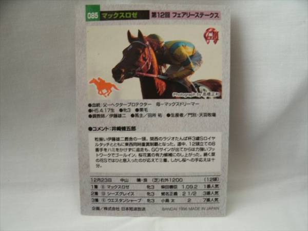 | ☆☆☆商品説明☆☆☆ 【メーカー】 バンダイ 【シリーズ】 95年サラブレッドカード 【番号】 085 マックスロゼ 【種類】 GⅢカード 【数量】 1枚 サラブレッドカードの第1弾95年度のカードになります。  |