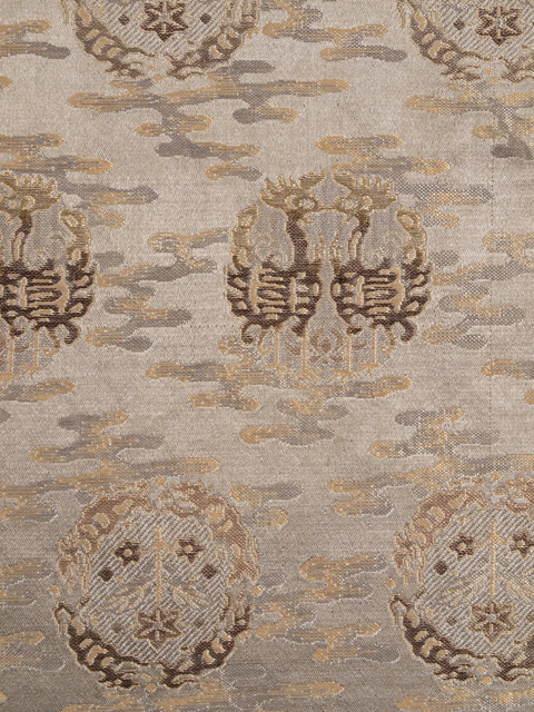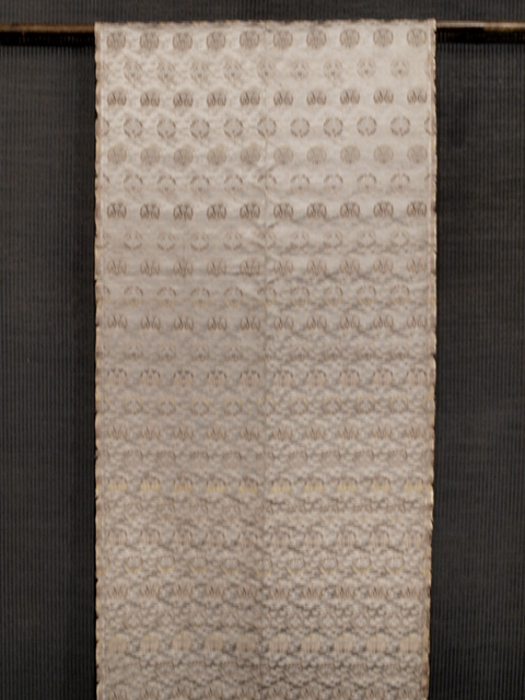 詳細 | 銀鼠(ぎんねず)色の地に、霞と向い鳳凰と花が配された丸の文様が織り込まれている西陣織の丸帯の解きです。 昭和初期ごろにつくられたと思われるアンティークのお品です。洗練された印象のあるお色目で、文様におもしろみが感じられます。 中央の折山と両端の綴じ山の全体にスレ感とくすみがあります。こまかなくすみやうすよごれなどはあるかもしれませんが、そのほかに目につく大きなしみやよごれ、褪色などのダメージ見当たらず、この時代のものとしては全体的にとてもきれいな状態です。 解き洗い済みです。 |