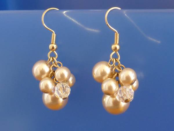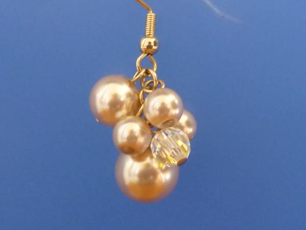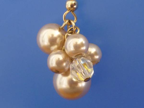※10mm真珠1個と8mm真珠1個と6mm真珠3個ときらきらストーン1個のコラボでゆらゆら揺れるかわいいデザインのピアスです。