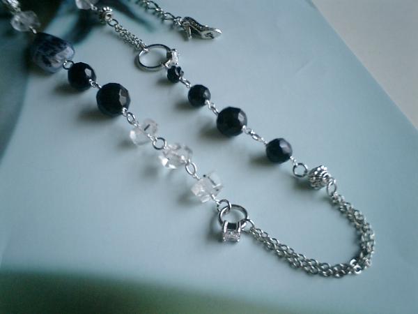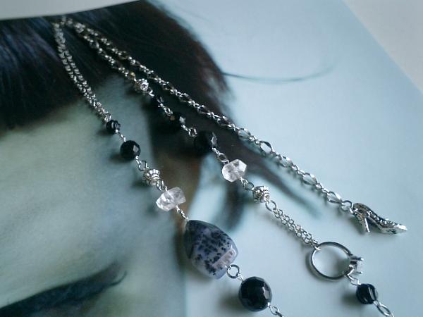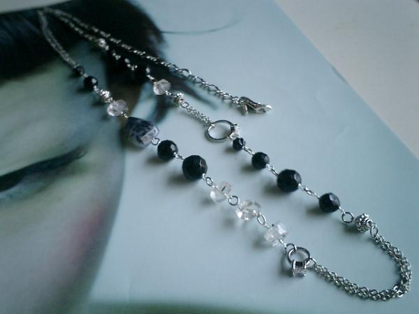 ロマンチック・ロマンチックシリーズです♪オニキスとブラックルチルの可憐なネックレスです!繊細でモダンな素材を合わせてアンティークな雰囲気です♪巴里の裏町をイメージして作りました♪オニキスは10ミリ、8ミリのラウンドカットと6ミリのSラインです♪ブラックルチルクォーツは12ミリから14ミリ位までのラフカットです♪ジルコニアのリングや繊細な模様の22×15ミリ位のデンドライトアゲートを合わせて神秘的な表情です♪長さは全長78センチ位で調節自由です♪2連にしても可愛いです♪シンプルで飽きのこないいつまでも着けられるデザインを考えて作りました!お揃いのブレスレットも出品しています♪ハンドメイドをご理解頂いてノークレーム、ノーリターンでお願いします