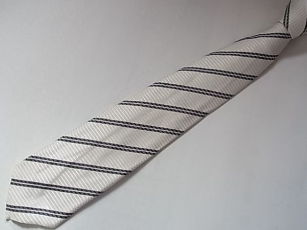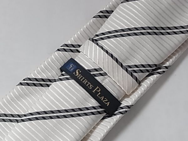 未使用品タグなしです。シャツプラザ(SHIRTS PLAZA)ネクタイです。素材はシルク(絹)100%。大剣最大幅約9cm。中国製。ストライプ柄。ベース色は白色ホワイト系。光沢があります。