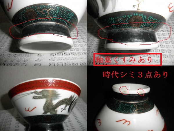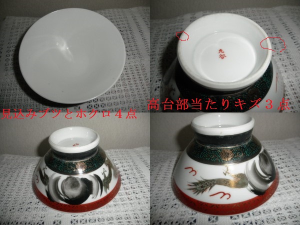 | 古い~ぃ九谷焼の大きなお茶碗1個です。 龍が勢いよく絵付けされています。 画像で表示のように見込みにブツ1点、ホクロ6点(虫食い含む) 高台部に当たりキズ3点 高台の上まわり釉薬のくすみ、時代シミ3点、時代擦れ等等ございます。 ご理解ください 古いものを愛するお方のご入札をお待ちしております。 画像でご判断をお願いいたします。 サイズ 口径15cm 高さ7.2cm お願い事項 ※細かい点を気になさるお方もしくは新品をお求めのお方は、ご入札をお控えください。 ご理解納得されてのご入札をお願いいたします。 ♪お客様のPC環境で、実物の商品の色と多少の誤差が生じる場合がございます。それらの点を十分ご理解いただいた上でご入札頂きますようお願い申し上げます。 ♪お客様の思い描くイメージが違うと言った返品はご勘弁ください。 ♪システム手数料・消費税、梱包代金等、一切頂戴致しておりませんので、ご安心して御落札下さい。 ♪発送は基本的に、ゆうパックでの発送になります。 ♪お安い送料を、ご希望される場合、補償はございませんが定形外920円可です。 ♪ゆうパック 60サイズ(持込割引120円引)となります ♪梱包材は原則的段ボールなど再生のものを利用しております。 プチプチで包んでしっかり丁寧梱包を心がけていますのでご安心ください。 | |||