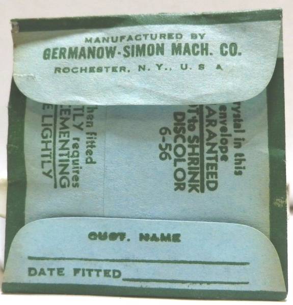 U.S.Aの時計パーツメーカー『GS/GERMANOW SIMON MACH CO.』の風防です。アメリカの風防専門メーカーです。40年代の未使用。デッドストックです!パッケージに年代を感じます。アンティークで多い四角形ドームの風防です。フラットタイプ風防の腕時計ではご使用できません。サイズは”25.5”(径)サイズです。プラスチック製!それなりの知識のある方向けです!。中古品ですので、ノークレーム、ノーリターンでお願いします。