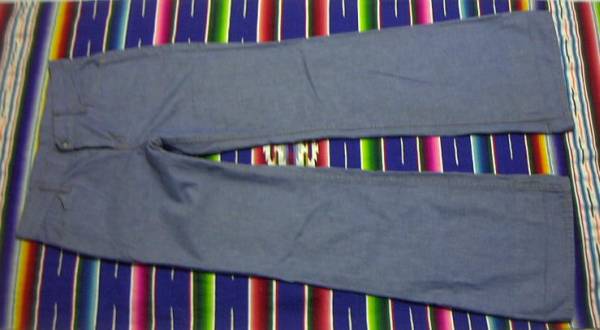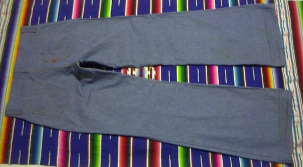 1960年代、LOVE & PEACE ウッドストック ヒッピームーブメントを彷彿させる、ベルボトムのインパクトの有る絶妙なシルエットライン、ハイオンスシャンブレー素材感、「SCOVILL GARDLOCK」ジッパー、オレンジ黒字タブ 等等 ビンテージオリジナルのディテールが極めて良い風合い