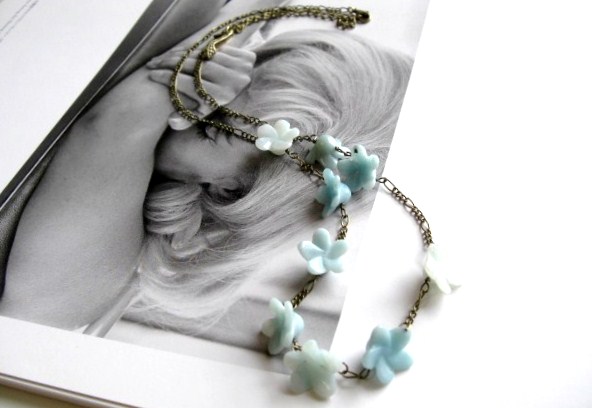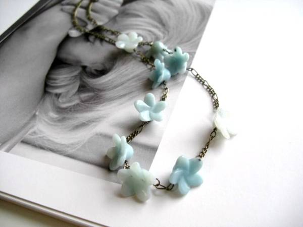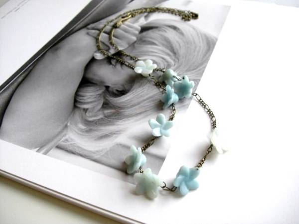 魔法にかけられて・・シリーズです♪シモーヌの恋人・・可憐な水色のアマゾナイトのネックレスです♪お花のブルーグレーのアマゾナイトにデザインチェーンを合わせてアンティークな表情です♪15ミリ位のアマゾナイトのお花はランダムに紡いで可憐な表情です♪長さは全長75センチ位で調節自由です♪チョーカー風にされても素敵です♪お揃いのネックレスやブレスレットも出品しています♪シンプルで飽きのこないいつまでも着けられるデザインを考えて作りました!ハンドメイドをご理解頂いてノークレーム、ノーリターンでお願いします