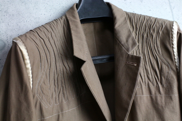 特徴的な肩のプリーツ部分と袖の切りっぱなし等様々な部分の凝ったデザインがかっこいいジャケットです。