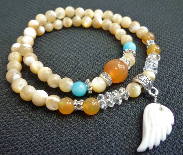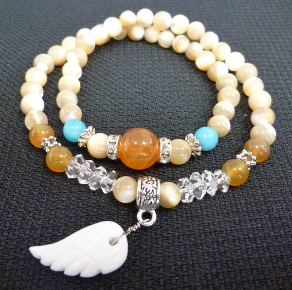 ☆オレンジカルセドニー、マザーオブパールのおしゃれな2連ブレスレットの商品です。