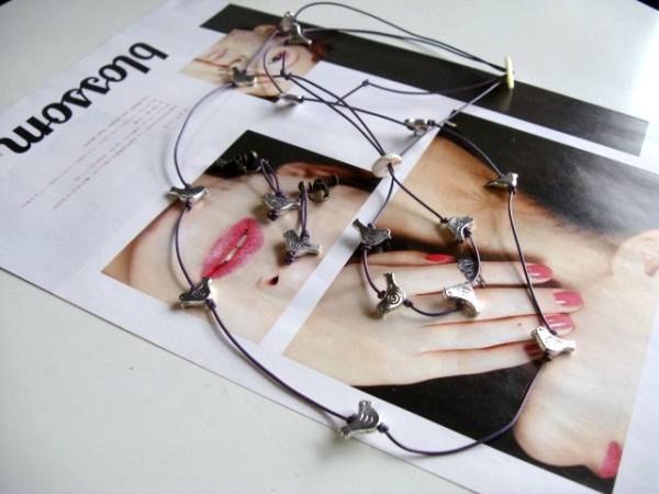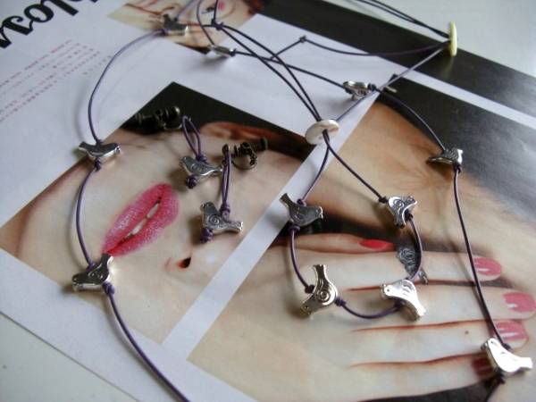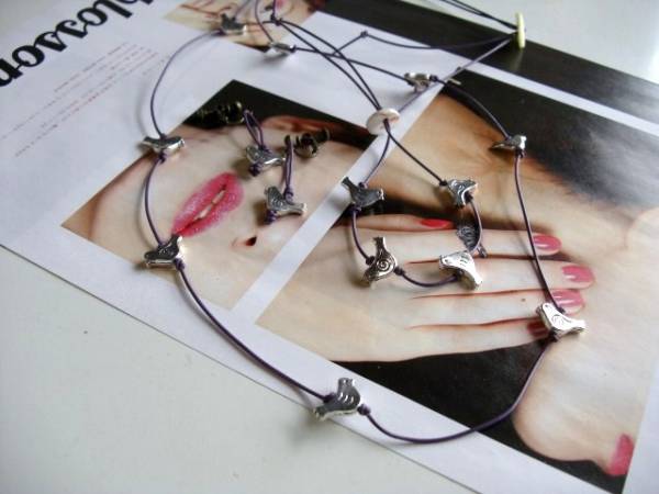 愛らしさの条件・・シリーズです♪小鳥さんマニア・・可憐な小鳥さんのチャームのネックレス、ブレスレット、イヤリングの3点セットです♪メタルチャームの小鳥さんをダークパープルのレザーコードに紡いでキュートな表情です♪小鳥さんは14×8ミリ位です♪ネックレスは100センチ位で調節自由です♪ブレスレットは28センチ位で調節出来ます♪イヤリングは全長4センチ位です♪それぞれ単品も出品しています♪ハンドメイドをご理解いただいてノークレーム、ノーリターンでお願いします♪