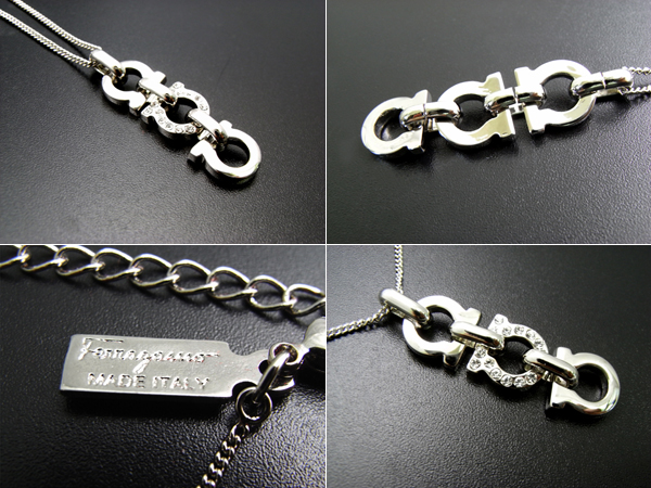 | 特徴 | フェラガモのペンダントです。ガンチーニが縦に3つ並び、真中のガンチーニにはラインストーンが施されています。女性らしく華やかに胸元を飾ります。 | ||