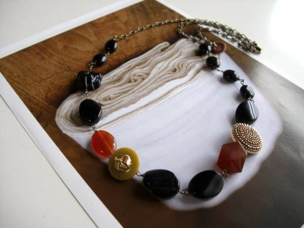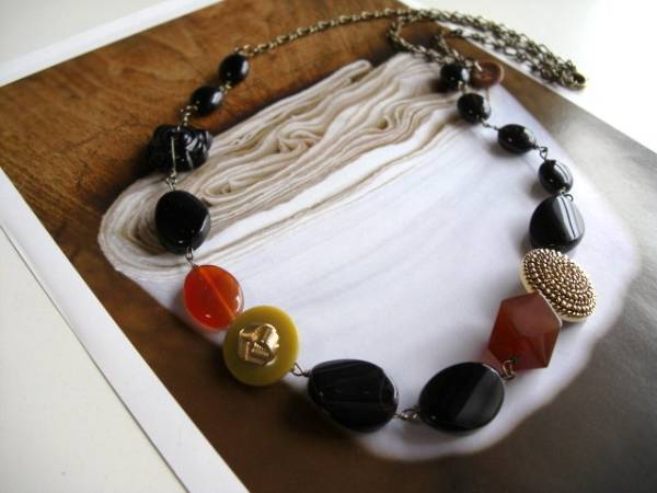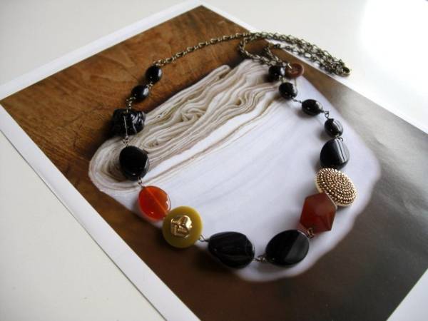 オーバルやオーバルツイストのオニキスにカーネリアンやアンティークボタンを合わせてキュートな表情です♪オニキスは12ミリから20ミリ位までカーネリアンは18ミリ位のラフカットです♪ネックレスの長さは全長72センチ位で調節自由です♪チョーカー風にされても素敵です♪お揃いのブレスレットも出品しています♪ハンドメイドをご理解いただいてノークレーム・ノーリターンでお願いします♪