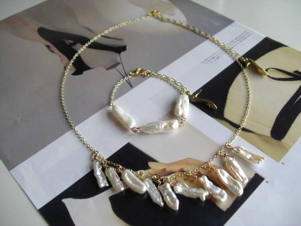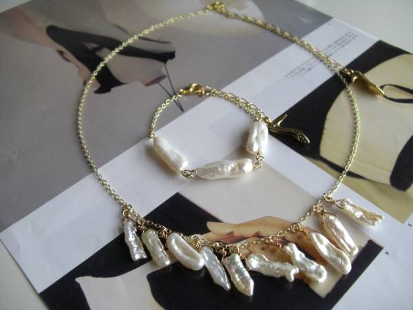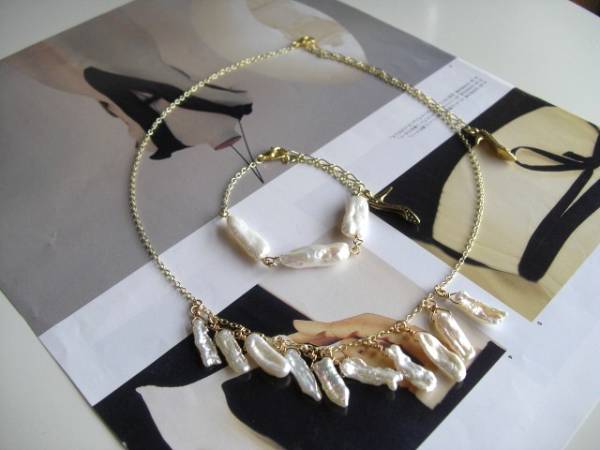 女の子らしさを+して・・シリーズです♪パール物語・・繊細な淡水ビワパールのネックレスとブレスレットの2点セットです♪華奢なチェーンを合わせて可憐な表情です♪ネックレスは16+7ミリ位のクレオデザインのビワパールです♪長さは50センチ+アジャスター10センチで最長60センチ位です♪ブレスレットは22+8センチ位のビワパールです♪長さは17センチ+アジャスター6センチで最長23センチ位です♪それぞれ単品やピアスも出品しています♪ハンドメイドをご理解頂いてノークレーム、ノーリターンでお願いします