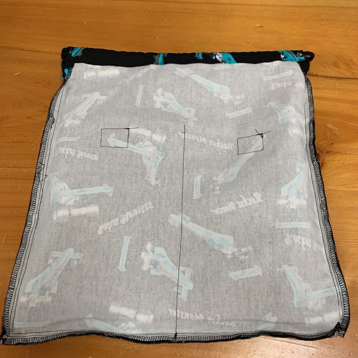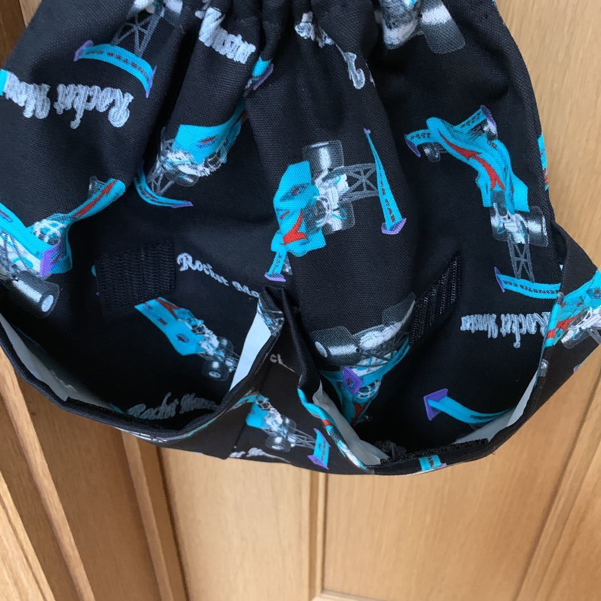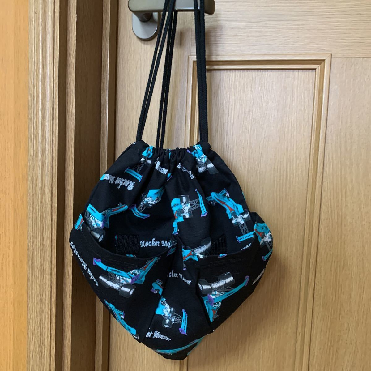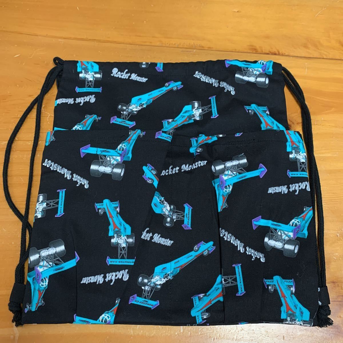 11. ハンドメイド レーシングカー 巾着袋 リュック ポケット2つマジックテープ&2タック 31X34cm 両紐 新品 未使用品 送料無料の出品です。
