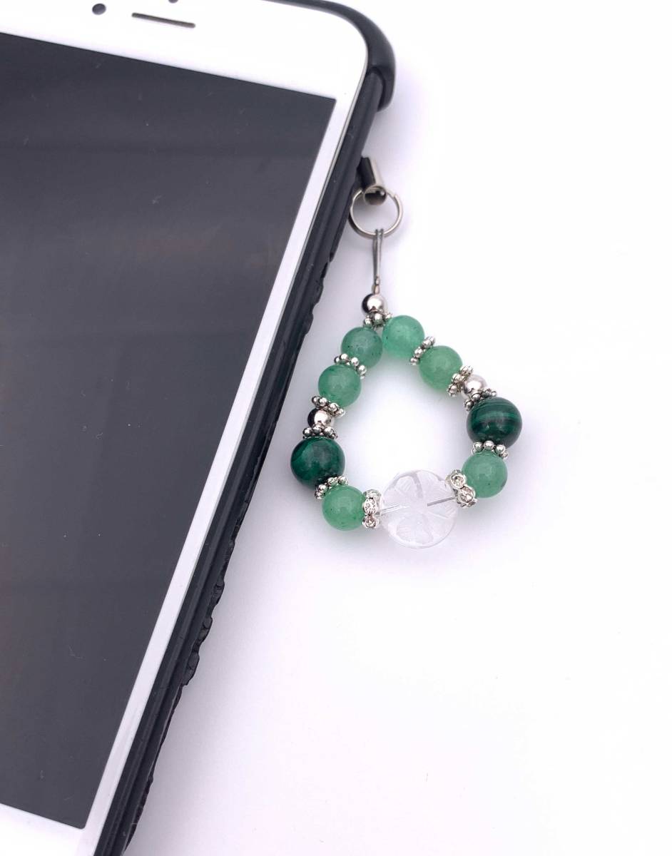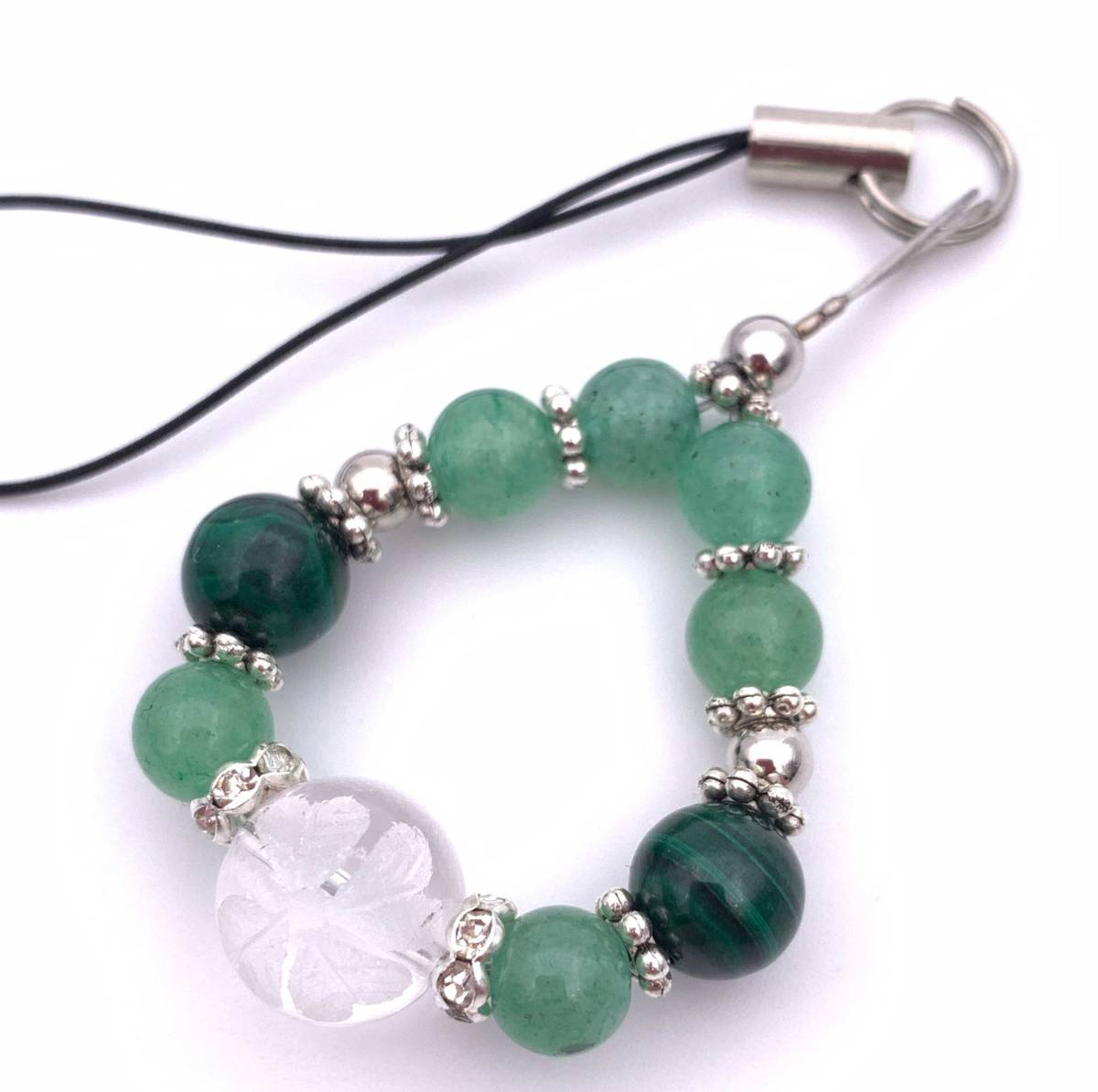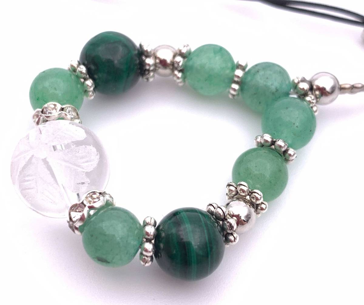 天然石手彫り水晶四葉のクローバー&マラカイト&アベンチュリンのストラップ