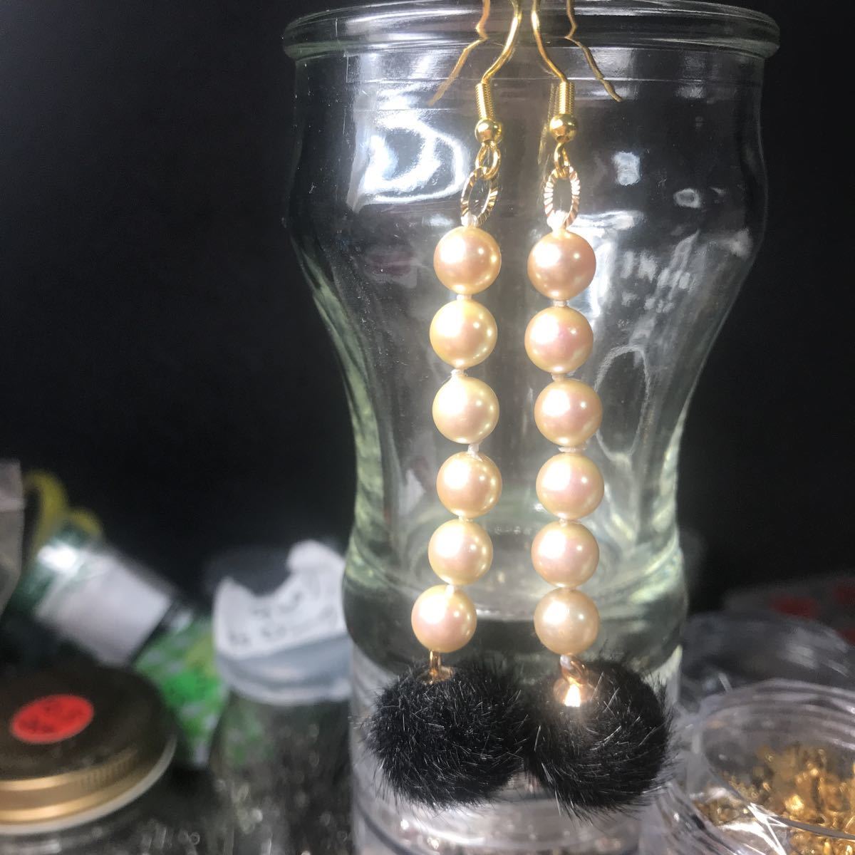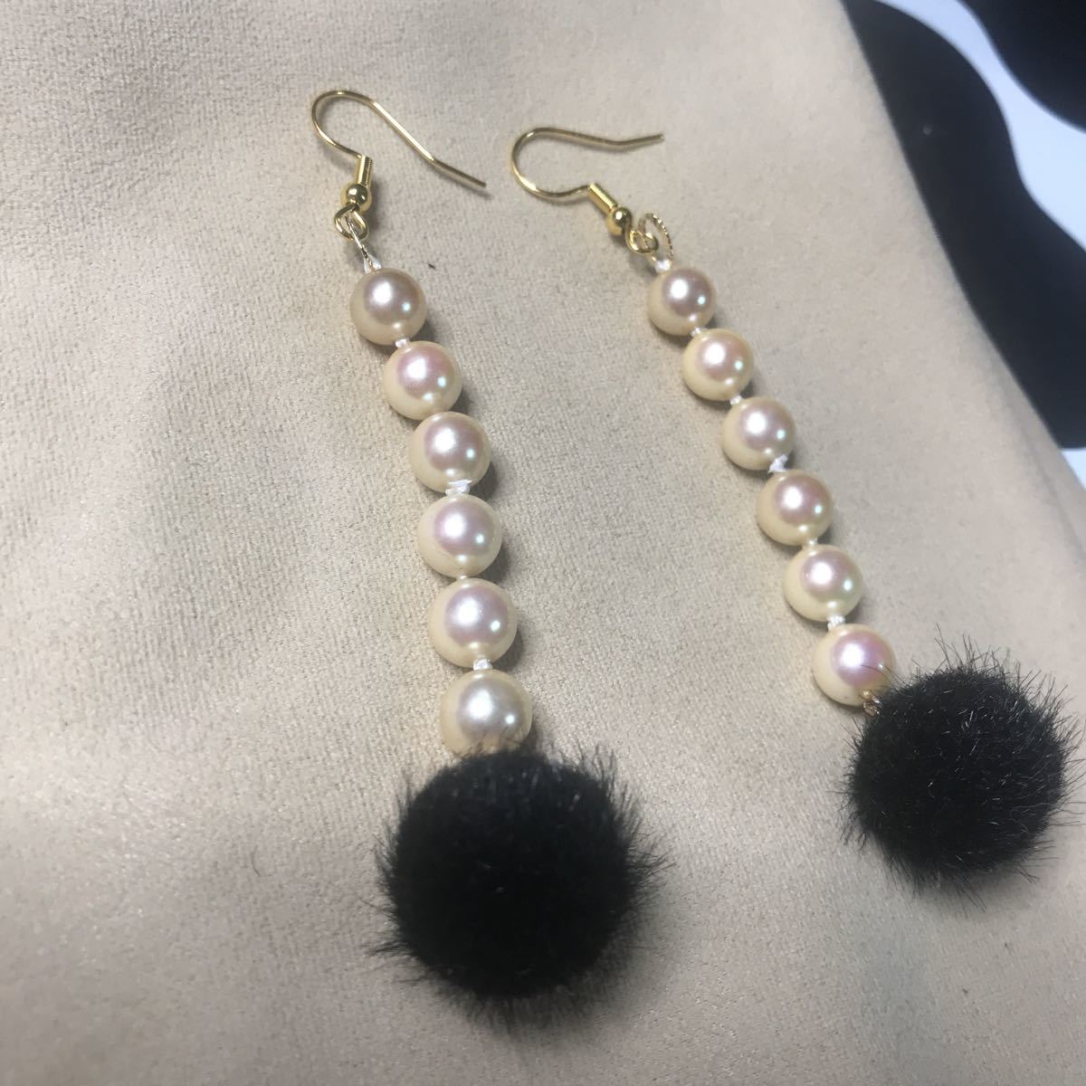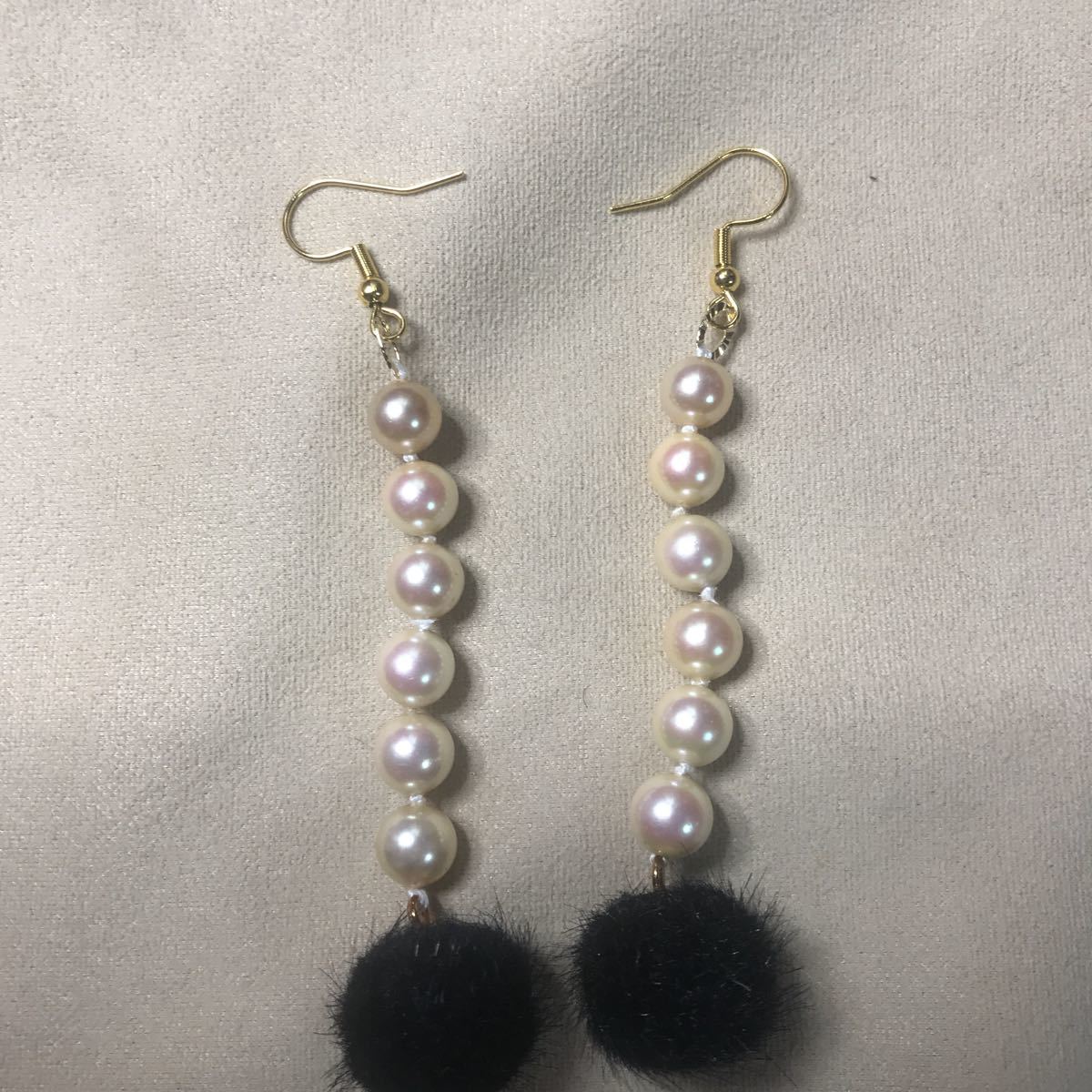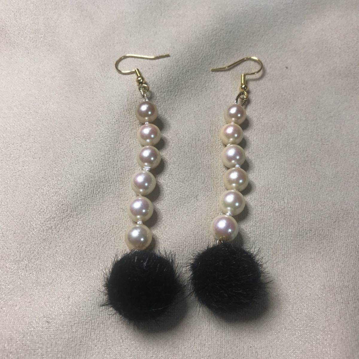 生成りの貝パールにファーボールをつけました。とても可愛いです。貝パールは糸で繋いでるので結び目等目立つ箇所あります、画像でもわかる通り貝パールは天然ならではのへこみキズ等ございます。
