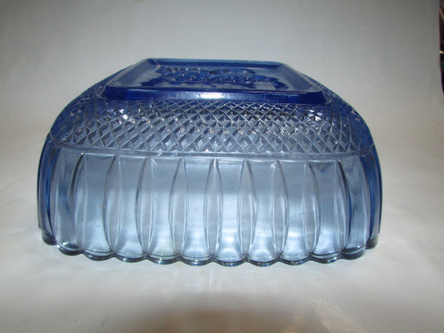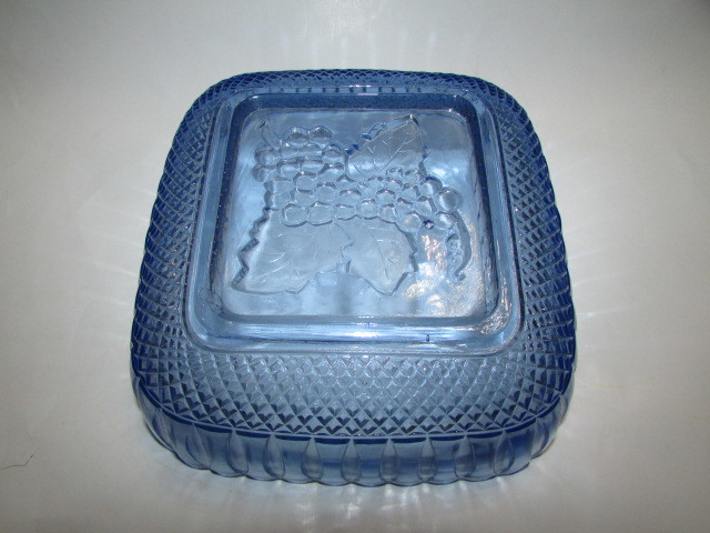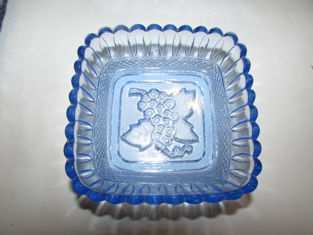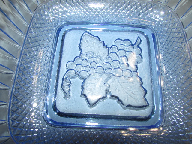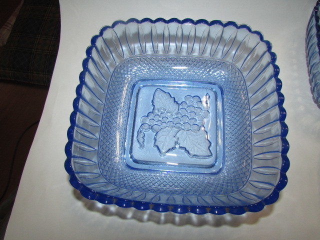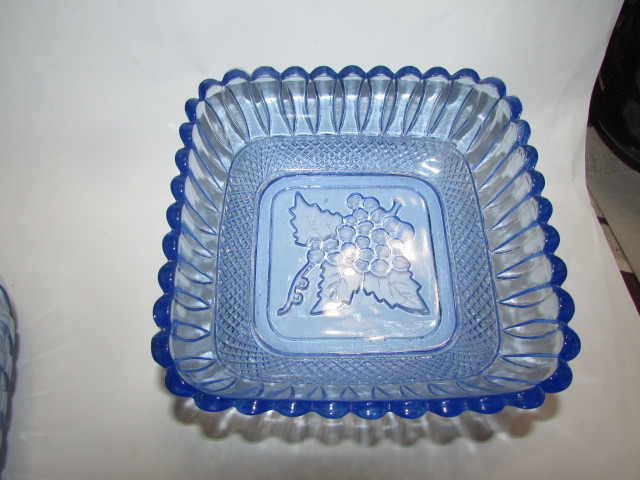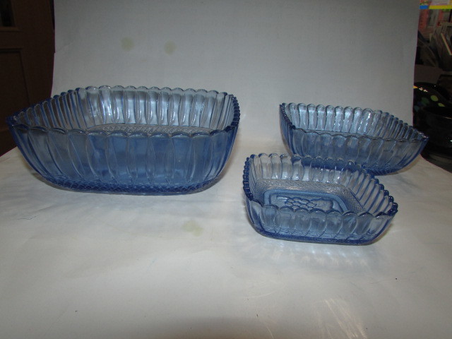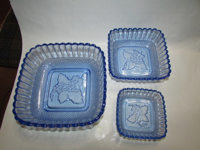 (旧家・蔵出)(古い時代の型物葡萄模様ブル-ガラス鉢大・中・小 一組)