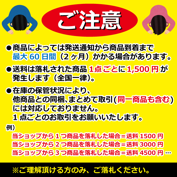 | また、こちらの商品は在庫の保管状況により同梱(同一商品も含む)での対応はできません。 そのため、 複数個ご落札いただいた場合、送料も個数分発生いたしますのでご注意ください。 | ||