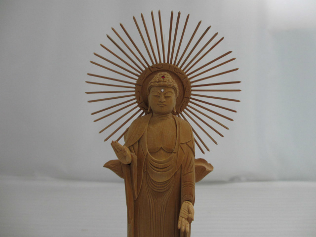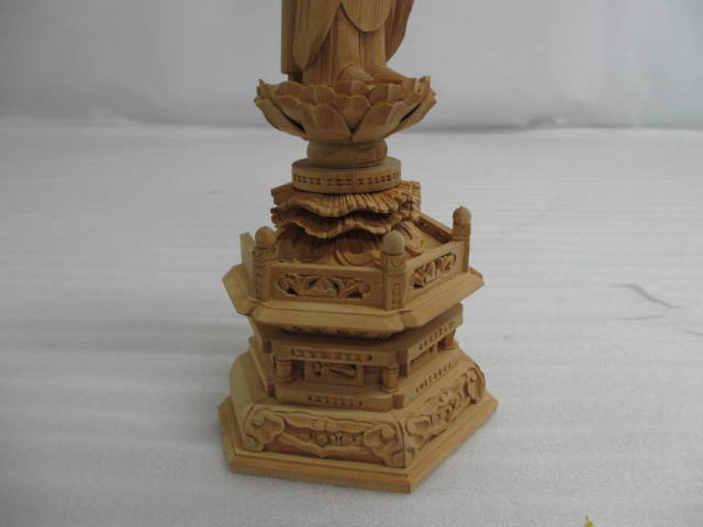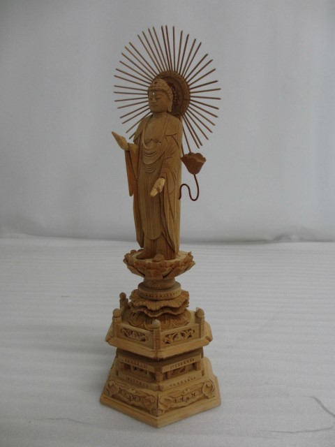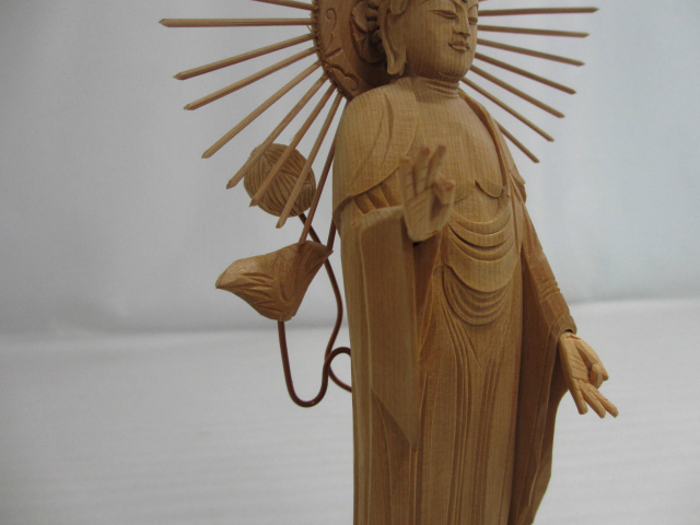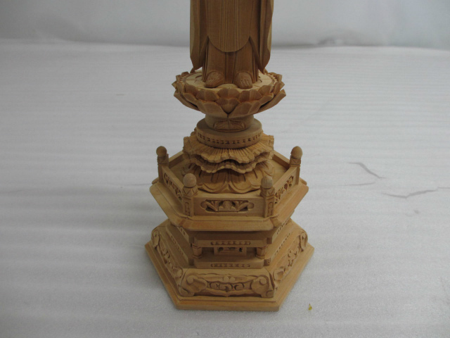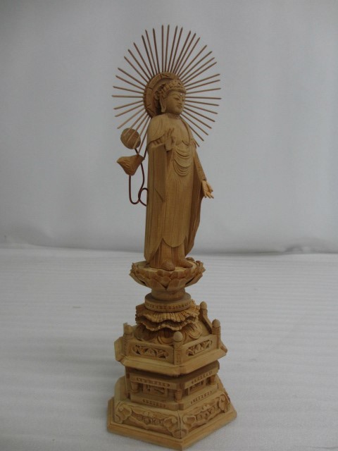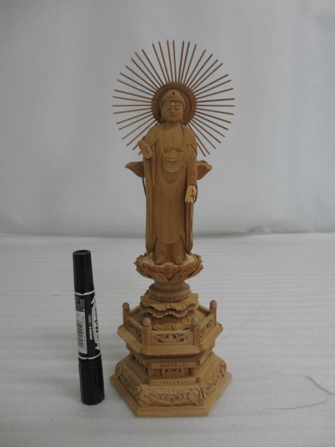 | 〇材質 木製仏像 〇サイズ 総高さ 約31センチ 台座幅 約12センチ 台座奥行 約8.5センチ 仏像身丈 約15センチ 〇状態 長期保管品の為、保管時の小傷、擦り傷等ある場合がございます。 注意事項 〇発送の際、光背、お仏像を台座から外しての発送となる場合がございます。 〇手計測のため、サイズに多少の誤差がある場合があります。 〇こちらは1点のみの出品です。 | |||