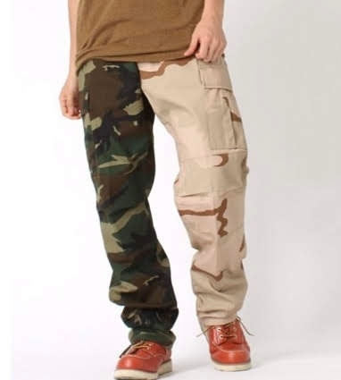 注目は各脚でカラーリングが異なる迷彩柄を使ったデザインです。